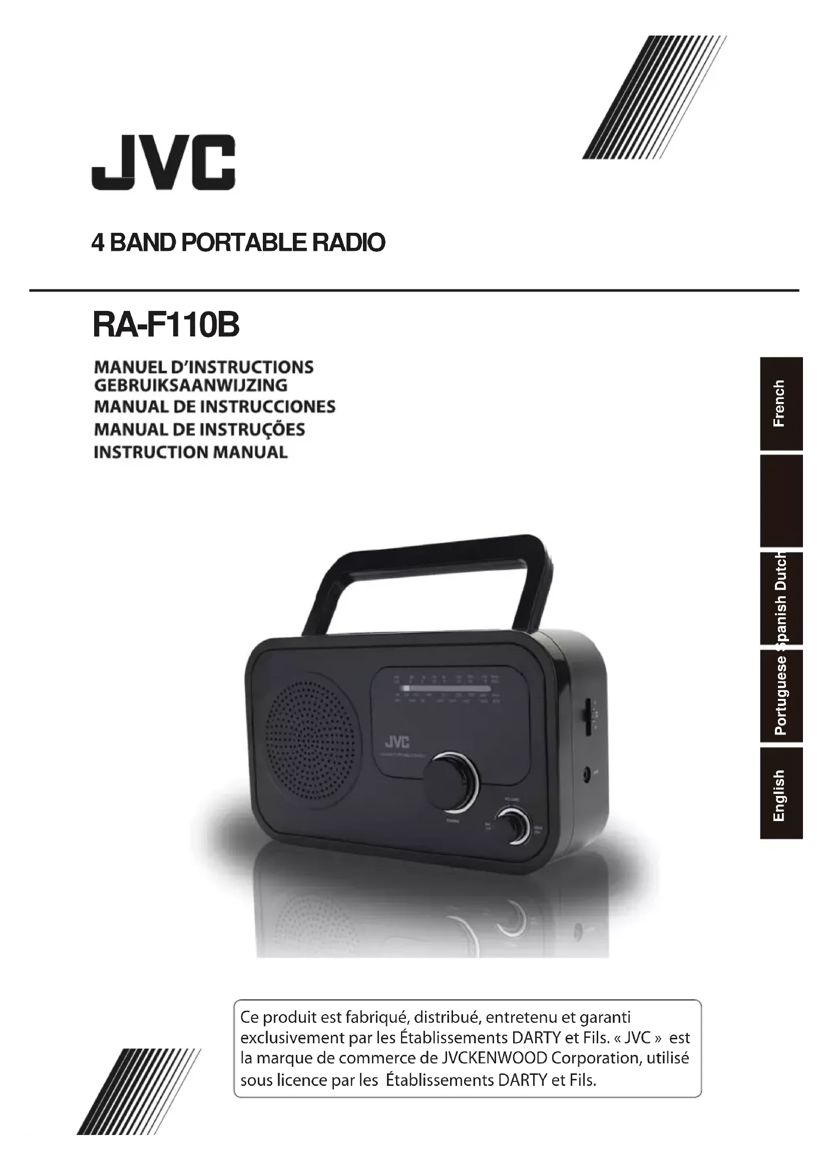 English Portuguese Spanish Dutch French Ce produit est fabriqué, distribué, entretenu et garanti exclusivement par les Établissements DARTY et Fils. « JVC » est la marque de commerce de JVCKENWOOD Corporation, utilisé sous licence par les Établissements DARTY et Fils.Mise au rebut d’une batterie dans un feu ou dans un four chaud, ou écrasement mécanique ou coupure d’une batterie ou être exposées à une chaleur excessive telle que celle du soleil, d'un feu ou d'origine similaire, susceptible de provoquer une explosion. Maintien d’une batterie dans un environnement à très haute température pouvant provoquer une explosion ou la fuite de liquide ou de gaz inflammab les. La batterie soumise à une pression de l’air extrêmement faible pouvant provoquer une explosion ou la fuite de liquide ou de gaz inflammables. Différents types de pile ne doivent pas être mélangées. Des piles neuves ne doivent pas mélangées à des piles usagées. Les piles doivent être installées en respectant la polarité +/-. Les piles usagées doivent être enlevées de l'appareil. Ne pas court- circuiter les piles.VOLUME MIN OFF MAX