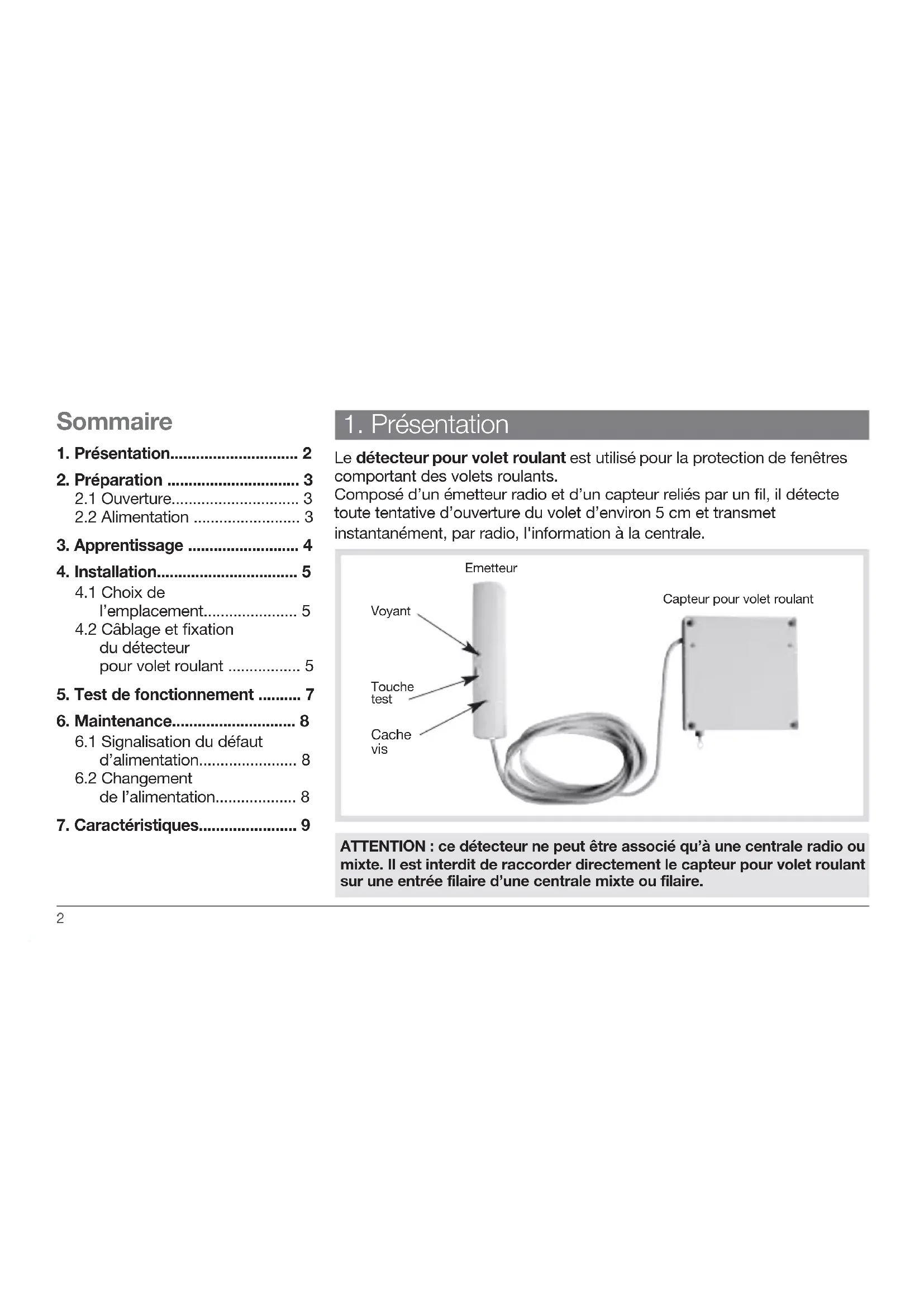 Le détecteur pour volet roulant est utilisé pour la protection de fenêtres comportant des volets roulants. Composé d’un émetteur radio et d’un capteur reliés par un fil, il détecte toute tentative d’ouverture du volet d’environ 5 cm et transmet instantanément, par radio, l'information à la centrale. ATTENTION : ce détecteur ne peut être associé qu’à une centrale radio ou mixte. Il est interdit de raccorder directement le capteur pour volet roulant sur une entrée filaire d’une centrale mixte ou filaire. Capteur pour volet roulantEmetteurVoyantTouche test Cache vis Sommaire