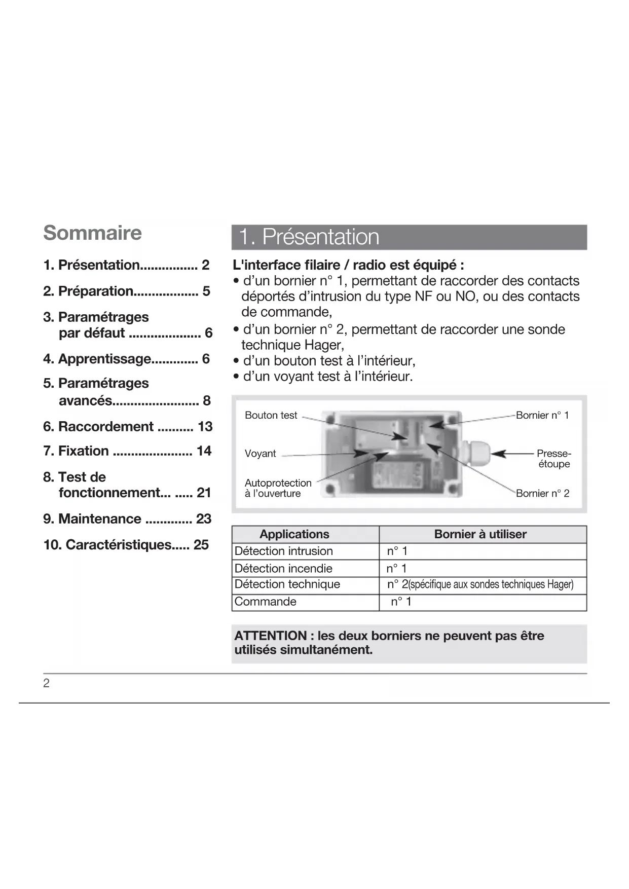 - d’un bornier n° 2, permettant de raccorder une sonde technique Hager,