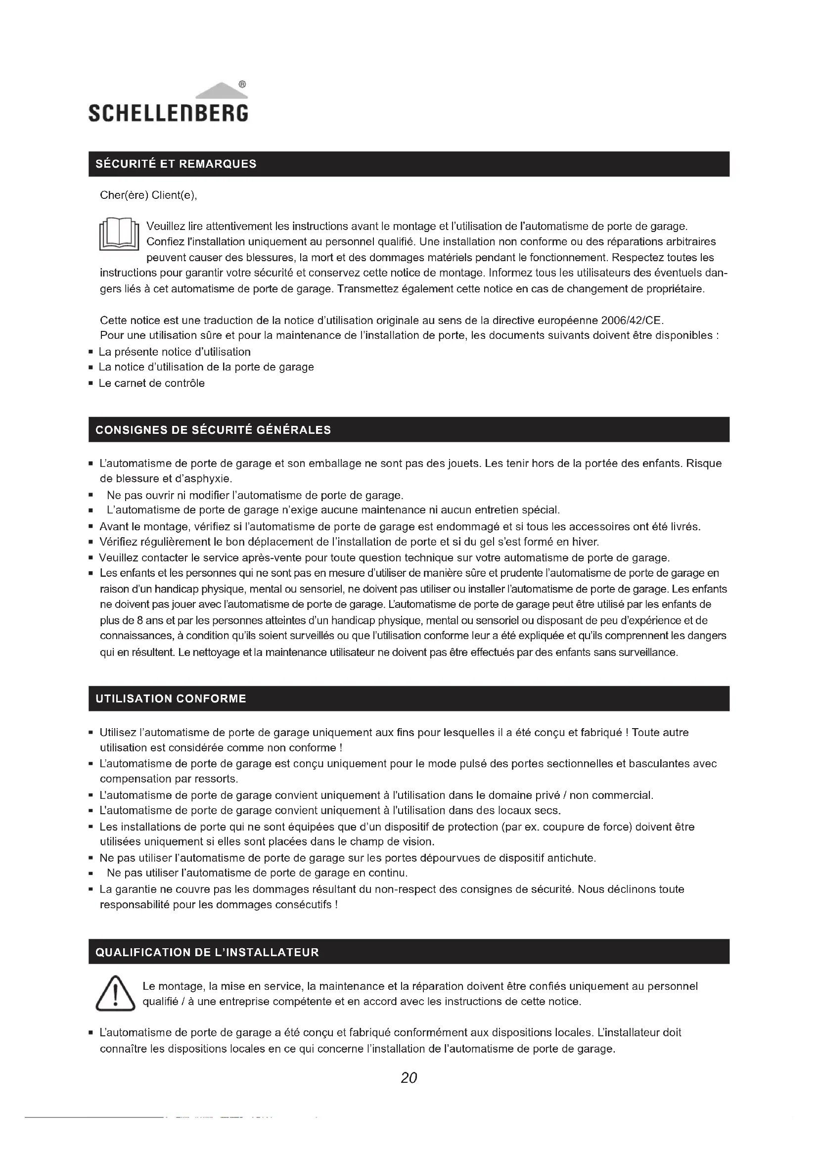 Le personnel non qualié ou les personnes qui ne connaissent par les normes de sécurité au travail pour les portes et portails automatiques ne doivent en aucun cas procéder à l’installation ni intervenir sur l’automatisme de porte de garage Les personnes qui ne respectent pas les normes de sécurité en vigueur pour l’installation et la maintenance sont responsables des dommages, blessures, coûts, dépenses et réclamations qui résultent du non-respect des normes de sécurité