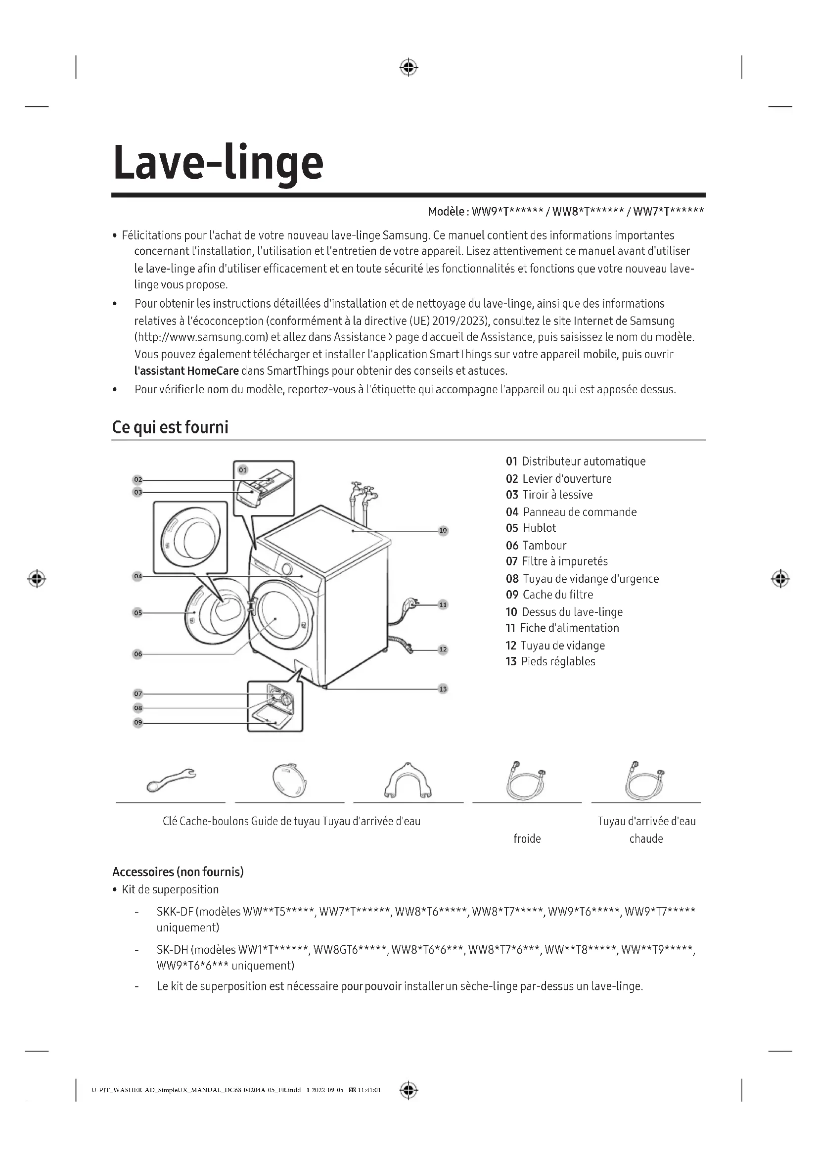 - Kit de superposition ‐ SKK-DF (modèles WW**T5*****, WW7*T******, WW8*T6*****, WW8*T7*****, WW9*T6*****, WW9*T7***** uniquement) ‐ SK-DH (modèles WW1*T******, WW8GT6*****, WW8*T6*6***, WW8*T7*6***, WW**T8*****, WW**T9*****, WW9*T6*6*** uniquement) ‐ Le kit de superposition est nécessaire pour pouvoir installer un sèche-linge par-dessus un lave-linge. U-PJT_WASHER-AD_SimpleUX_MANUAL_DC68-04204A-05_FR.indd 1 2022-09-05 11:41:01Français2 Consignes de sécurité REMARQUE