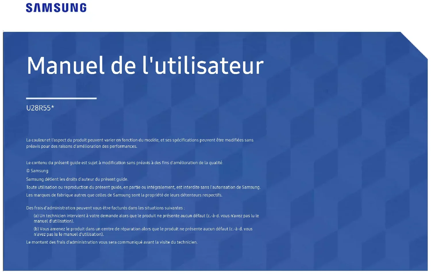 - Réparation effectuée par une personne qui ne représente pas un prestataire de services externe ou un partenaire agréé par Samsung Electronics Co., Ltd. • Refonte ou réparation du produit effectuée par le client.