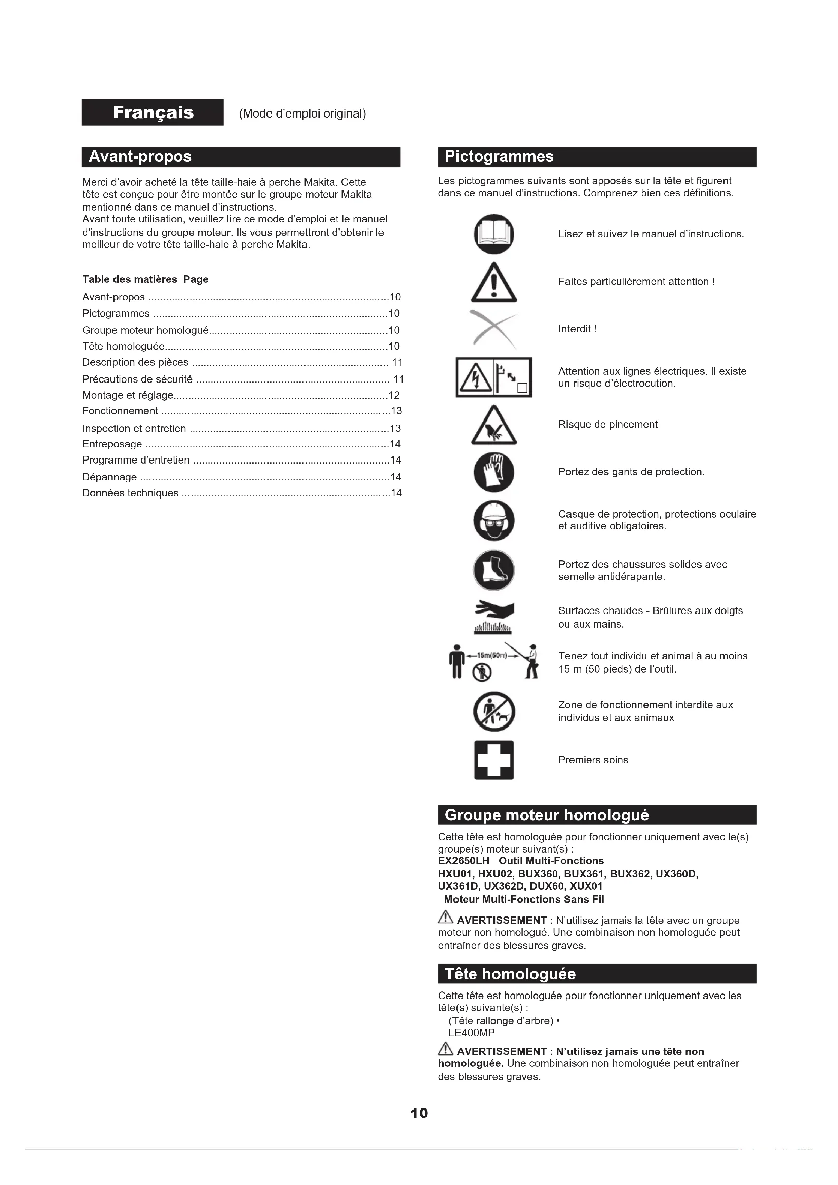moteur non homologué. Une combinaison non homologuée peut entraîner des blessures graves. Tête homologuée Cette tête est homologuée pour fonctionner uniquement avec les tête(s) suivante(s) : (Tête rallonge d’arbre) • LE400MP