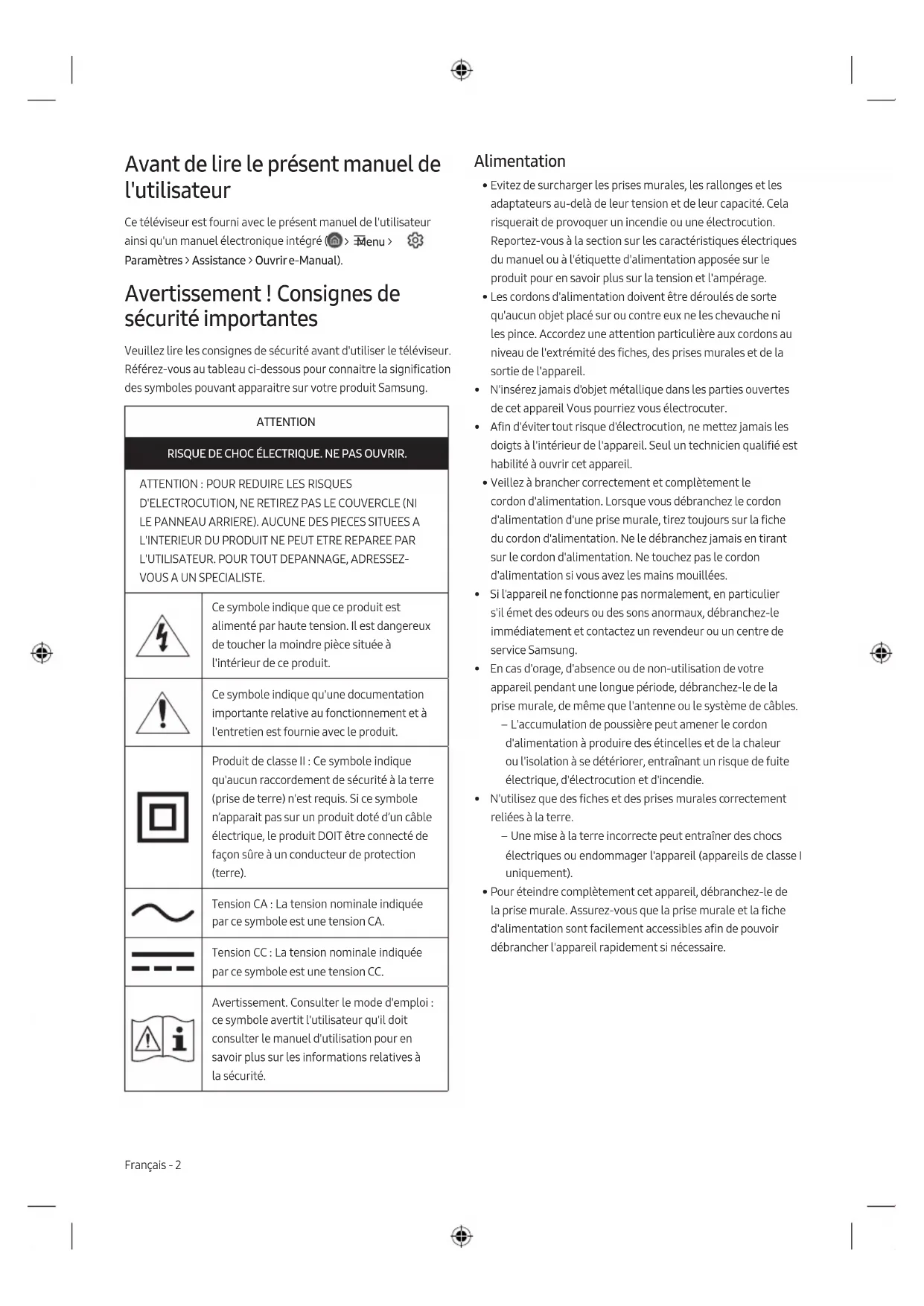 - The type of battery may vary depending on the model. English - 9 EnglishAvant de lire le présent manuel de l'utilisateur Ce téléviseur est fourni avec le présent manuel de l'utilisateur ainsi qu'un manuel électronique intégré ( > Menu > Paramètres > Assistance > Ouvrir e-Manual). Avertissement! Consignes de sécurité importantes Veuillez lire les consignes de sécurité avant d'utiliser le téléviseur. Référez-vous au tableau ci-dessous pour connaitre la signification des symboles pouvant apparaitre sur votre produit Samsung. ATTENTION RISQUE DE CHOC ÉLECTRIQUE. NE PAS OUVRIR.
