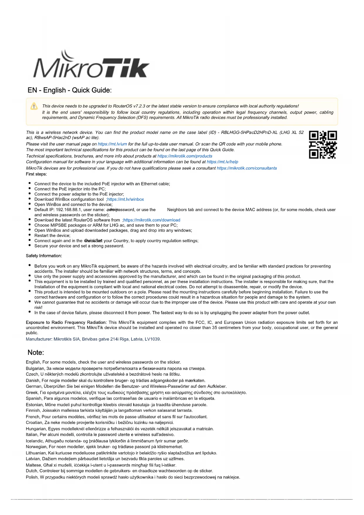 Il s'agit d'un périphérique réseau sans fil. Vous pouvez trouver le nom du modèle du produit sur l'étiquette du boîtier (ID) - RBLHGG-5HPacD2HPnD-XL (LHG XL 52 ac),RBwsAP-5Hac2nD (wsAP ac lite). Veuillez visiter la page du manuel d'utilisation sur pour le manuel d'utilisation complet et à jour.https://mt.lv/um-fr Ou scannez le code QR avec votre téléphone portable. Les spécifications techniques les plus importantes de ce produit se trouvent sur la dernière page de ce guide rapide. Spécifications techniques, brochures et plus d'informations sur les produits surhttps://mikrotik.com/products Vous trouverez le manuel de configuration du logiciel dans votre langue avec des informations supplémentaires sur https://mt.lv/help-fr Les appareils MikroTik sont destinés à un usage professionnel. Si vous n'avez pas de qualifications, veuillez consulter un consultant https://mikrotik.com /consultants Premiers pas: Connectez l'appareil à l'injecteur PoE fourni avec un câble Ethernet; Connectez l'injecteur PoE au PC; Connectez l'adaptateur d'alimentation à l'injecteur PoE; Téléchargez l'outil de configuration WinBox ;https://mt.lv/winbox Ouvrez WinBox et connectez-vous à l'appareil; IP par défaut: 192.168.88.1, nom d'utilisateur: , pas de mot de passe, ou utilisez l' admin ongletNeighborset connectez-vous avec l'adresse MAC; Téléchargez le dernier logiciel RouterOS sur ;https://mikrotik.com/download Choisissez les packages MIPSBE ou ARM pour LHG ac et enregistrez-les sur votre PC; Ouvrez WinBox et téléchargez les packages téléchargés, glissez-déposez dans toutes les fenêtres; Redémarrez l'appareil; Connectez-vous à nouveau et définissez votre pays dans le menu pour appliquer les paramètres de réglementation du pays; QuickSet Sécurisez votre appareil et définissez un mot de passe fort. Information sur la sécurité: Avant de travailler sur un équipement MikroTik, soyez conscient des dangers liés aux circuits électriques et familiarisez-vous avec les pratiques standard de prévention des accidents. Le programme d'installation doit être familiarisé avec les structures, les termes et les concepts du réseau. Utilisez uniquementl'alimentation et accessoires approuvés par le fabricant,etquipeuvent être a trouvé dansl'emballage d'origine de ce produit. Cet équipement doit être installé par du personnel formé et qualifié, conformément à ces instructions d'installation. L'installateur est responsable de s'assurer que l'installation de l'équipement est conforme aux codes électriques locaux et nationaux. N'essayez pas de démonter, réparer ou modifier l'appareil. Ce produit est destiné à être monté à l'extérieur sur un poteau. Veuillez lire attentivement les instructions de montage avant de commencer l'installation. Le fait de ne pas utiliser lematériel et la configuration corrects ou de ne pas suivre les procédures correctes peut entraîner une situation dangereuse pour les .personnes et endommager le système Nous ne pouvons garantir qu'aucun accident ou dommage ne se produira en raison d'une mauvaise utilisation de l'appareil. Veuillez utiliser ce produit avec soin et l'utiliser à vos propres risques! En cas de panne de l'appareil, veuillez le déconnecter de l'alimentation. La façon la plus rapide de le faire est de débrancher l'adaptateur secteur de la prise de courant. Cet appareil doit être mis à niveau vers RouterOS v7.2.3 ou la dernière version pour garantir la conformité aux réglementations des autorités locales. Il est de la responsabilité des utilisateurs finaux de suivre les réglementations locales du pays, y compris le fonctionnement dans les canaux de fréquence légaux, la sortie