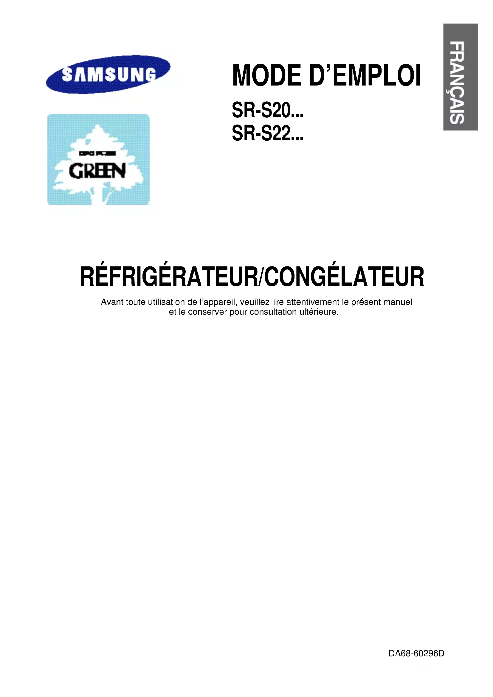 SR-S 2 0 . . . SR-S 2 2 . . . R É F R I G É R AT E U R / C O N G É L AT E U R Avant toute utilisation de l’appareil, veuillez lire attentivement le présent manuel et le conserver pour consultation ultérieure. DA68-60296D SR-S2026-FRE 3/29/59 6:28 PM Page 1Ces précautions ont pour but de prévenir les utilisateurs de l’appareil contre les risques de blessures éventuelles. Veillez à les respecter. Après en avoir pris connaissances, conservez-les en lieu sûr pour une consultation ultérieure. C A R AC T É R I S T I QU E S Réfrigérateur/congélateur à économie d’énergie