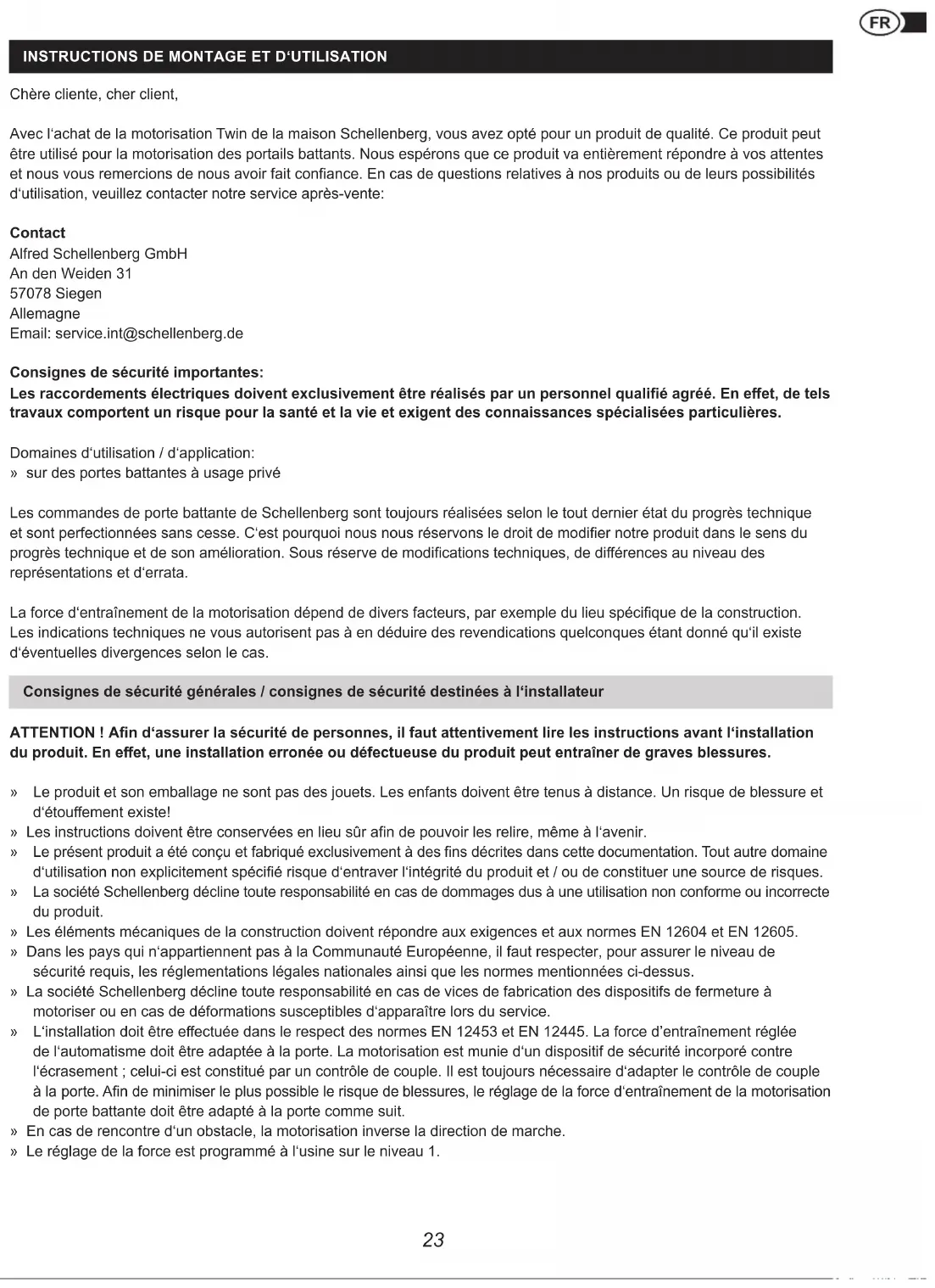 Chère cliente, cher client, Avec l‘achat de la motorisation Twin de la maison Schellenberg, vous avez opté pour un produit de qualité. Ce produit peut être utilisé pour la motorisation des portails battants. Nous espérons que ce produit va entièrement répondre à vos attentes et nous vous remercions de nous avoir fait conance. En cas de questions relatives à nos produits ou de leurs possibilités d‘utilisation, veuillez contacter notre service après-vente: Contact Alfred Schellenberg GmbH An den Weiden 31 57078 Siegen Allemagne Email: service.int@schellenberg.de Consignes de sécurité importantes: Les raccordements électriques doivent exclusivement être réalisés par un personnel qualié agréé. En eet, de tels travaux comportent un risque pour la santé et la vie et exigent des connaissances spécialisées particulières. Domaines d‘utilisation / d‘application: » sur des portes battantes à usage privé Les commandes de porte battante de Schellenberg sont toujours réalisées selon le tout dernier état du progrès technique et sont perfectionnées sans cesse. C‘est pourquoi nous nous réservons le droit de modier notre produit dans le sens du progrès technique et de son amélioration. Sous réserve de modications techniques, de diérences au niveau des représentations et d‘errata. La force d‘entraînement de la motorisation dépend de divers facteurs, par exemple du lieu spécique de la construction. Les indications techniques ne vous autorisent pas à en déduire des revendications quelconques étant donné qu‘il existe d‘éventuelles divergences selon le cas. Consignes de sécurité générales / consignes de sécurité destinées à l‘installateur ATTENTION ! An d‘assurer la sécurité de personnes, il faut attentivement lire les instructions avant l‘installation du produit. En eet, une installation erronée ou défectueuse du produit peut entraîner de graves blessures. » Le produit et son emballage ne sont pas des jouets. Les enfants doivent être tenus à distance. Un risque de blessure et d‘étouement existe! » Les instructions doivent être conservées en lieu sûr an de pouvoir les relire, même à l‘avenir. » Le présent produit a été conçu et fabriqué exclusivement à des ns décrites dans cette documentation. Tout autre domaine d‘utilisation non explicitement spécié risque d‘entraver l‘intégrité du produit et / ou de constituer une source de risques. » La société Schellenberg décline toute responsabilité en cas de dommages dus à une utilisation non conforme ou incorrecte du produit. » Les éléments mécaniques de la construction doivent répondre aux exigences et aux normes EN 12604 et EN 12605. » Dans les pays qui n‘appartiennent pas à la Communauté Européenne, il faut respecter, pour assurer le niveau de sécurité requis, les réglementations légales nationales ainsi que les normes mentionnées ci-dessus. » La société Schellenberg décline toute responsabilité en cas de vices de fabrication des dispositifs de fermeture à motoriser ou en cas de déformations susceptibles d‘apparaître lors du service. » L‘installation doit être eectuée dans le respect des normes EN 12453 et EN 12445. La force d’entraînement réglée de l‘automatisme doit être adaptée à la porte. La motorisation est munie d‘un dispositif de sécurité incorporé contre l‘écrasement ; celui-ci est constitué par un contrôle de couple. Il est toujours nécessaire d‘adapter le contrôle de couple à la porte. An de minimiser le plus possible le risque de blessures, le réglage de la force d‘entraînement de la motorisation de porte battante doit être adapté à la porte comme suit. » En cas de rencontre d‘un obstacle, la motorisation inverse la direction de marche. » Le réglage de la force est programmé à l‘usine sur le niveau 1.