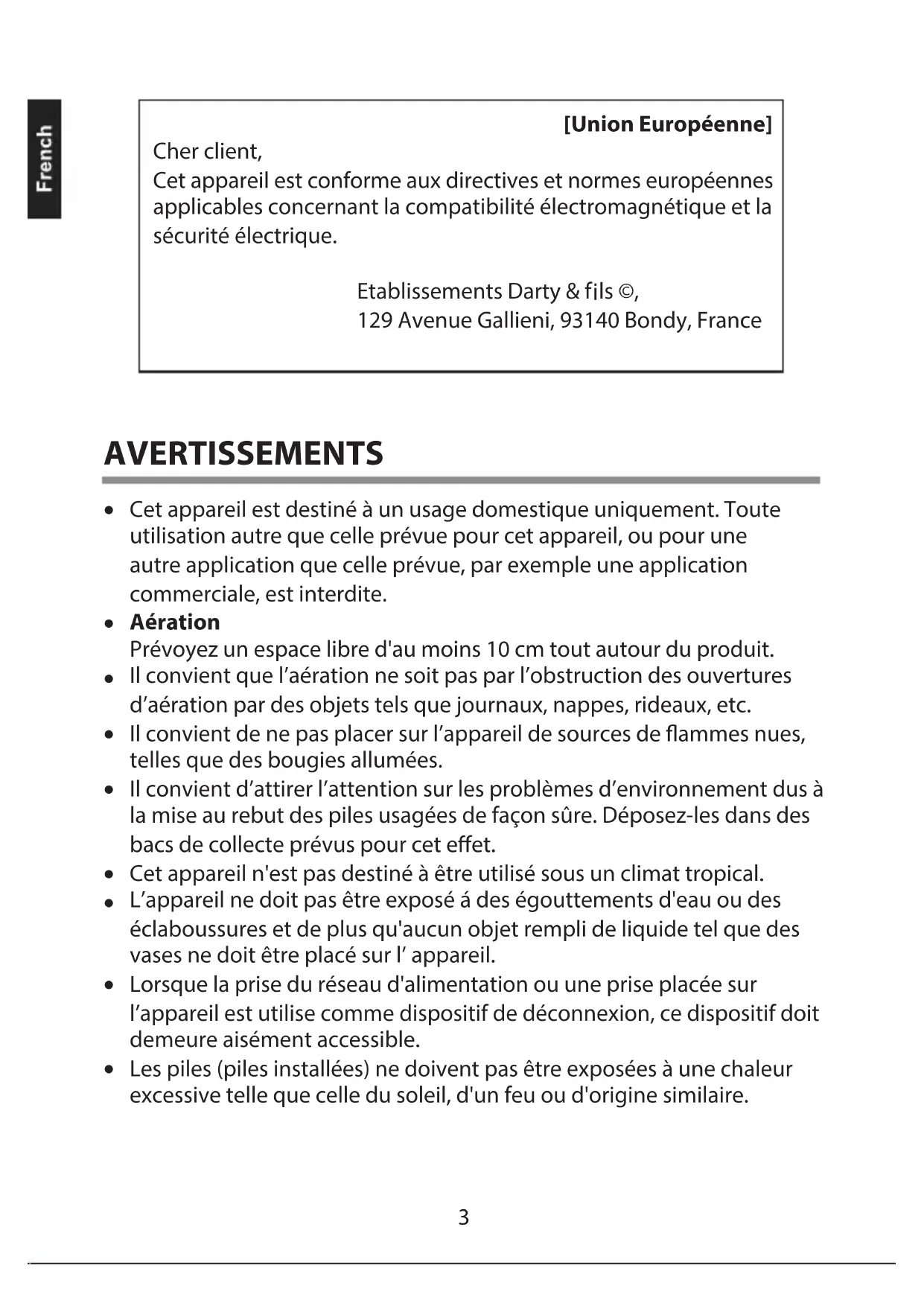 En tant que distributeur responsable, nous accordons une grande importance à la protection de l’environnement. Nous vous encourageons à respecter les procédures correctes de mise au rebut de votre appareil, des piles et des éléments d’emballage. Cela aidera à préserver les ressources naturelles et à garantir qu’il soit recyclé d’une manière respectueuse de la santé et de l’environnement. Vous devez jeter ce produit et son emballage selon les lois et les règles locales. Puisque ce produit contient des composants électroniques et parfois des piles, le produit et ses accessoires doivent être jetés séparément des déchets domestiques lorsque le produit est en n de vie. Pour plus de renseignements sur les procédures de mise au rebut et de recyclage, contactez les autorités de votre commune. Apportez l’appareil à un point de collecte local pour qu’il soit recyclé. Certains centres acceptent les produits gratuitement. Hotline Darty France Quels que soient votre panne et le lieu d'achat de votre produit en France, avant de vous déplacer en magasin Darty, appelez le 0 978 970 970 (prix d'un appel local) 7j/7 et 24h/24. Hotline Vanden Borre Le service après-vente est joignable au +32 2 334 00 00, du lundi au vendredi de 8h à 18h et le samedi de 9h à 18h. En raison des mises au point et améliorations constamment apportées à nos produits, de petites incohérences peuvent apparaître dans ces instructions. Veuillez nous excuser pour la gêne occasionnée. Etablissements Darty & f