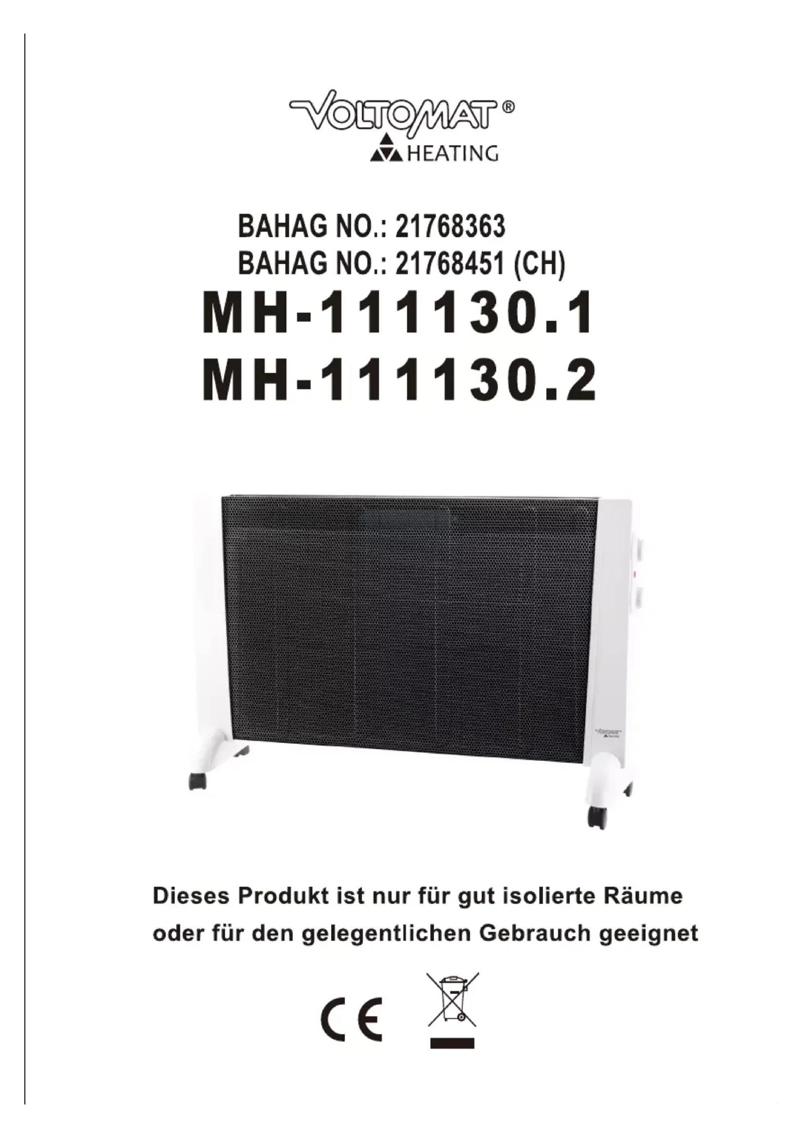 Tension d’opération: 220-240V ~ 50/60Hz Consommation énergétique: 2200-2400W Recyclage – Directive européenne 2012/19/EU Ce symbole indique que le produit ne doit pas être jeté avec les ordures ménagères. Afin éviter toute atteinte à l'environnement ou à la santé humaine due à une mise au rebut non contrôlée, recyclez cet appareil de façon responsable pour promouvoir la revalorisation des matières premières. Pour vous débarrasser de votre appareil usagé, veuillez le retourner à un centre de tri ou contactez le détaillant qui vous l'a vendu. Ils seront à même de prendre en charge le recyclage de ce produit de façon écologique.- 66 - Informations ERP (FR) Fournisseur : BAHAG AG Gutenbergstr. 21 68167 Mannheim GERMANY Déclare que le produit désigné ci-dessous : Exigences d'informations applicables aux dispositifs de chauffage décentralisés électriques Référence(s) du modèle : 21768363, 21768451 Caractéristique Symbole Valeur Unité Caractéristique Unité Puissance thermique