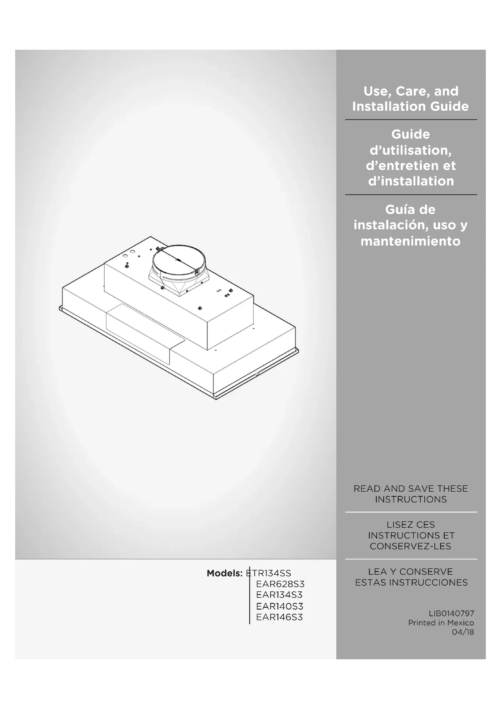 - Ôter les filtres. Dimensions du placard Cette hotte a la flexibilité de pour être installé de deux façons diérentes, en fonction de la taille de la largeur ou superficie entre l’armoire de gauche et de droite. Avant de commencer, vous avez besoin de savoir qui est la zone de ce domaine et d’envisager les mesures dans le tableau ci-dessous. Hotte Modèle Hotte Largeur sans entretoise Hotte Largeur avec entretoise Profondeur de la Hotte EAR628S3 28½” (72 cm) 30” (76.2 cm) 22” (55.9 cm) EAR134S3 34½” (87 cm) 36” (91.44 cm) EAR140S3 40½” (102 cm) 42” (106.68 cm) EAR146S3 46½” (117.5 cm) 48” (121.92 cm) ETR134SS 34½” (87 cm) 36” (91.44 cm) 18” (45.7 cm) Voir la tableVoir la tableLe support de la hotte doit être capable de soutenirune charge de 75 lb (34 kg)“X” Distance entre le basdu auvent et la surface decuissonIMPORTANT:Valeur minimale de la distance “X” : 24” (61 cm) à partir des surfaces de cuisson électriques.Valeur minimale de la distance “X” : 30” (76,2 cm) à partir des sur-faces de cuisson au gaz. Installation del entretoise de la hotte
