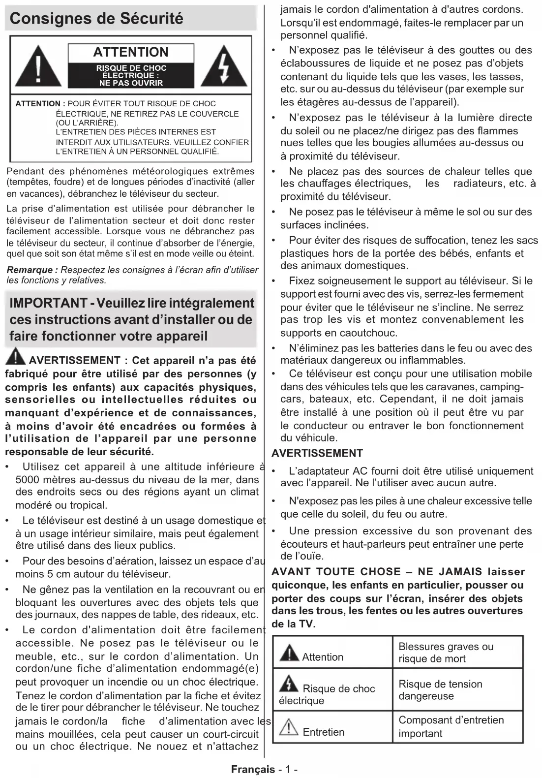 - Ce téléviseur est conçu pour une utilisation mobile dans des véhicules tels que les caravanes, camping- cars, bateaux, etc. Cependant, il ne doit jamais être installé à une position où il peut être vu par le conducteur ou entraver le bon fonctionnement du véhicule. AVERTISSEMENT