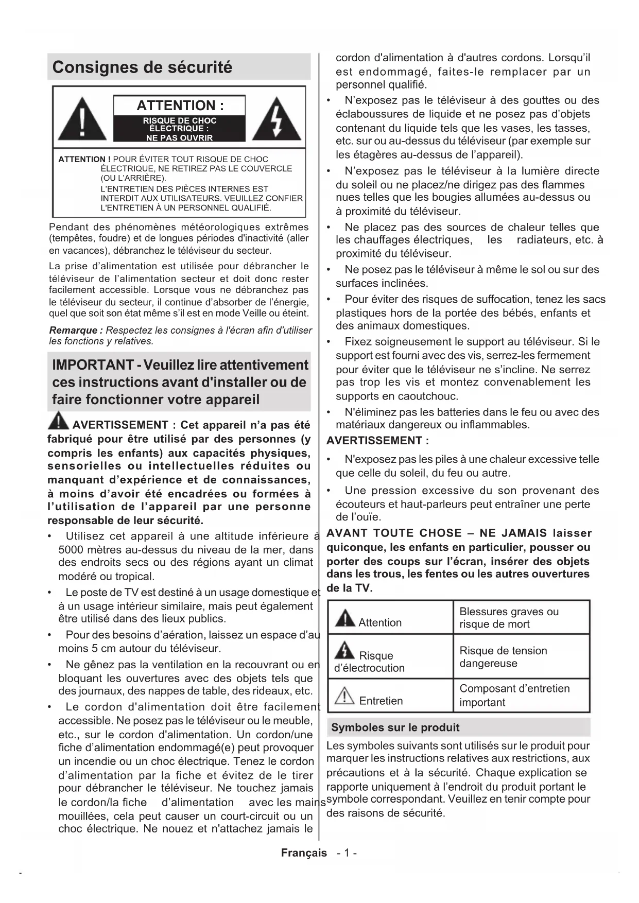 N'exposez pas les piles à une chaleur excessive telle que celle du soleil, du feu ou autre. Une pression excessive du son provenant des écouteurs et haut-parleurs peut entraîner une perte de l’ouïe. AVANT TOUTE CHOSE – NE JAMAIS laisser quiconque, les enfants en particulier, pousser ou porter des coups sur l’écran, insérer des objets dans les trous, les fentes ou les autres ouvertures de la TV. Attention Blessures graves ou risque de mort Risque d’électrocution Risque de tension dangereuse Entretien Composant d’entretien important Symboles sur le produit Les symboles suivants sont utilisés sur le produit pour marquer les instructions relatives aux restrictions, aux précautions et à la sécurité.
