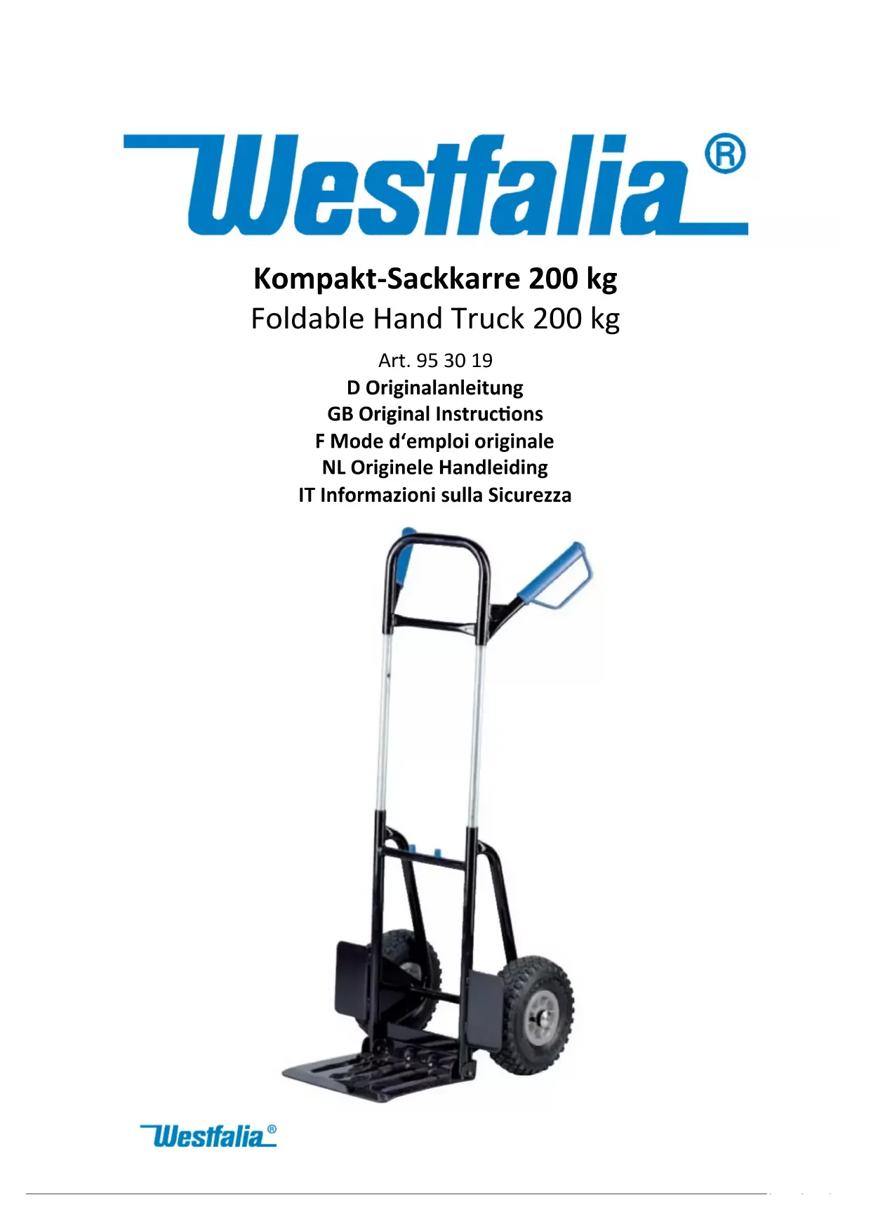 Technical Data Dimensions ready for Use: 1070 x 470 x 570 mm (H x W x D) Dimensions folded: 720 x 470 x 210 mm (H x W x D) Dimensions of the Loading Plate: 290 x 300 mm Wheel Diameter / Width: 260 x 85 mm Tyre Pressure: max. 2,5 bar Load Capacity: 200 kg Operation7 S'il vous plaît noter afin d'éviter des dysfonctionnements, des dommages et des effets néfastes sur la santé les informations suivantes: