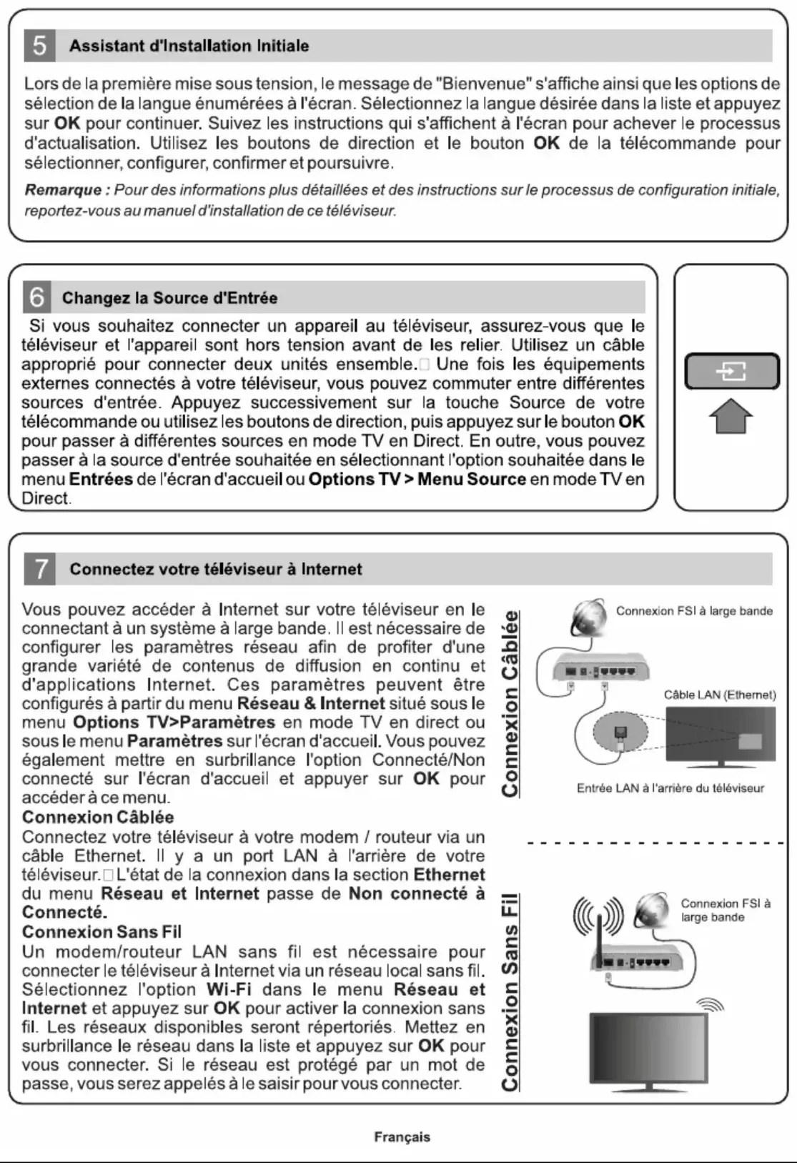 ouvre le menu des paramètres des sous-titres (le cas échéant) (**)En fonction du modèleFrançais - 5 - Licences LestermesHDMI,HDMIHigh-DenitionMultimedia Interface, HDMI trade dress et les logos HDMI sont des marques ou des marques déposées de HDMI Licensing Administrator, Inc. Fabriqué sous licence par Dolby Laboratories. Dolby, Dolby Audio,et le symbole du double D sont des marques déposées de Dolby Laboratories Licensing Corporation. Google, Android, Android TV, Chromecast, Google Play et YouTube sont les marques commerciales de Google LLC. (**)Pour les brevets DTS, reportez-vous à http:// patents.dts.com. Fabriqué sous licence par DTS Licensing Limited. DTS, DTS-HD, Virtual:X et le logo DTS-HD sont des marques déposées ou des marques déposées de DTS, Inc. aux États-Unis et dans d’autres pays. © 2022 DTS, Inc. TOUS DROITS RÉSERVÉS. Cet appareil est doté d’une technologie dont les droits de propriété intellectuelle reviennent à Microsoft. L'utilisation ou la distribution de cette technologie en dehors de ce produit est interdite sans la les licences appropriées de Microsoft. Les propriétaires de contenus utilisent la technologie d’accès au contenu Microsoft PlayReady™ pour protéger leur propriété intellectuelle, ainsi que les contenus protégés par des droits d’auteur. Ce dispositif utilise la technologie PlayReady pour accéder à son contenu protégé et/ou à celui de la technologie de gestion de droits numériques Windows Media (WMDRM). Si le dispositif échoue dans l’application des restrictions relatives à l’utilisation de contenu, les propriétaires de contenus peuvent exiger de Microsoft l’annulation de l’utilisation par le dispositif du contenu protégéPlayReady.Cetteannulationn’aectepasles contenus non protégés ou ceux protégés par d’autres technologies d’accès au contenu. Les propriétaires de contenus pourraient vous demander de mettre à niveau PlayReady pour accéder à leurs contenus. Si vous ignorez la mise à niveau, vous ne pourrez pas accéder au contenu qui requiert une mise à niveau. Le Logo « CI Plus » est une marque de commerce de CI Plus LLP. Ce produit est protégé par certains droits de propriété intellectuelle de Microsoft Corporation. L’utilisation ou la distribution de cette technologie en dehors de ce produit est interdite sans licence de Microsoft ou d’une lialeautoriséedeMicrosoft. Informations de la disposition [Union européenne] Ces symboles signifient que l'appareil électrique et électronique de même que la batterie portant ce symbole ne doivent pas être mis au rebut comme des déchetsménagersordinairesàlandeleursdurées de vie. Au contraire, ils doivent être acheminés aux points de collecte indiqués pour le recyclage des équipements électriques et électroniques, ainsi que les batteries pour un traitement, une récupération et un recyclage correct conformément à la législation en vigueur dans votre pays et aux directives 2012/19/EU et 2013/56/EU. En effectuant une bonne mise au rebut de ces produits, vous contribuerez ainsi à la préservation des ressources naturelles et aiderez par le fait même à éviter de potentiels effets négatifs sur l’environnement et la santé humaine qui, dans le cas contraire, pourraient être occasionnés par une gestion inadéquate des déchets générés par ces produits. Pour plus d’informations sur les points de collecte et le recyclage de ces produits, contactez les autorités locales, le centre de collecte des ordures ménagères ou le magasin où vous avez acheté le produit. Conformément à la législation en vigueur dans votre pays, des pénalités peuvent être imposées pour mauvaise mise au rebut de ce déchet. (Utilisateurs commerciaux) Si vous souhaitez procéder à la mise au rebut du présent appareil, veuillez entrer en contact avec votre fournisseur et prenez connaissance des conditions générales du contrat d’achat. [Pour les autres pays hors de l’Union Européenne] Ces symboles ne sont valides qu’au sein de l’Union Européenne. Contactez les autorités locales pour vous informer sur la mise au rebu et le recyclage. L’appareil et son emballage doivent être déposés à votre point de collecte local pour recyclage. Certains centres de collecte acceptent des produits gratuitement. Remarque : Le symbole Pb en dessous du symbole pour les piles indique que ces piles contiennent du plomb.