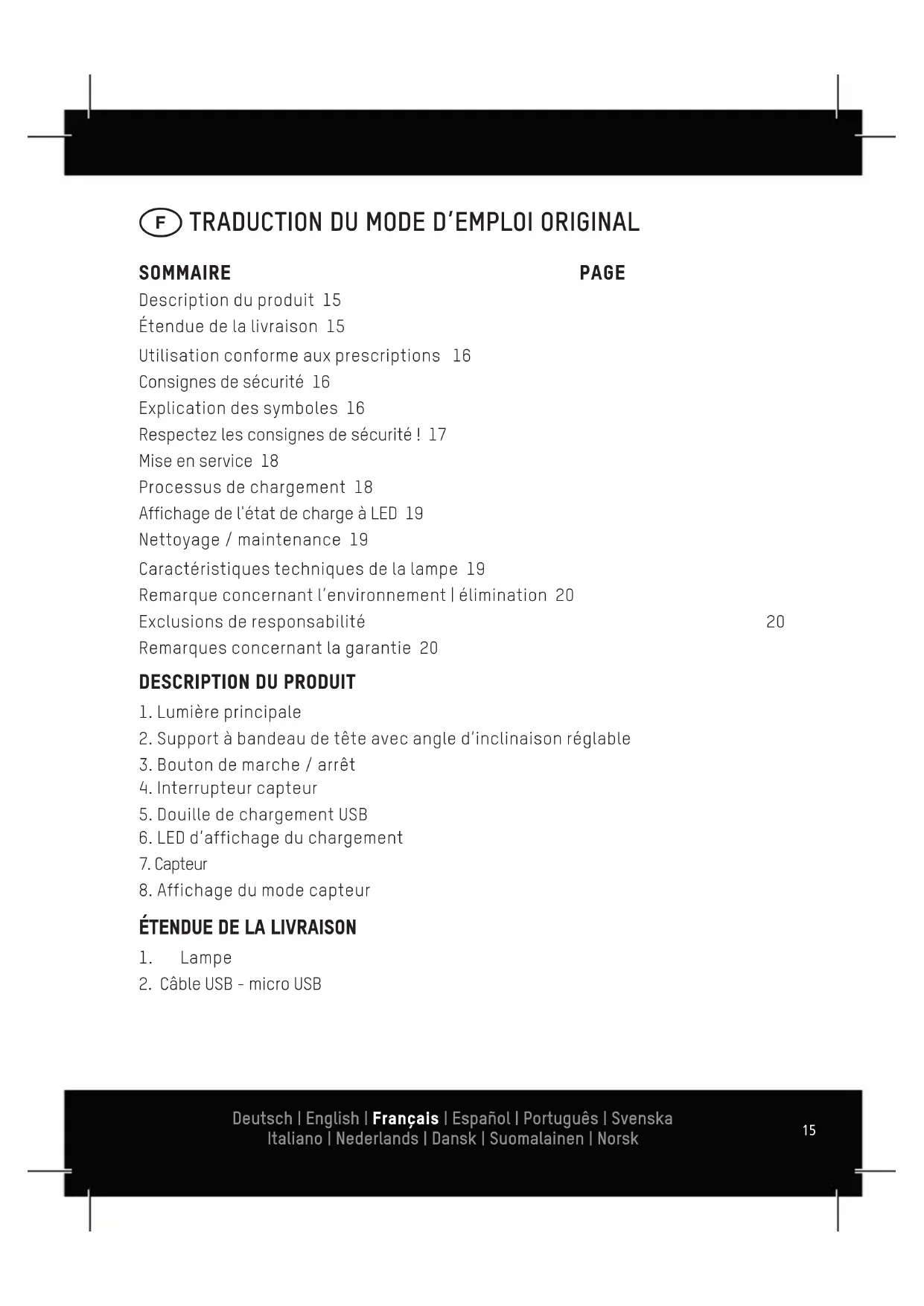 Description du produit 15 Étendue de la livraison 15 Utilisation conforme aux prescriptions 16 Consignes de sécurité 16 Explication des symboles 16 Respectez les consignes de sécurité ! 17 Mise en service 18 Processus de chargement 18 Affichage de l'état de charge à LED 19 Nettoyage / maintenance 19 Caractéristiques techniques de la lampe 19 Remarque concernant l’environnement | élimination 20 Exclusions de responsabilité 20 Remarques concernant la garantie 20 Deutsch | English | Français | Español | Português | Svenska Italiano | Nederlands | Dansk | Suomalainen | Norsk Deutsch | English | Français | Español | Português | Svenska Italiano | Nederlands | Dansk | Suomalainen | Norsk16 Déballez toutes les pièces et contrôlez leur intégralité et la présence éventuelle de dommages. Ne pas mettre en service un produit endommagé. Si vous constatez des dommages sur le produit, contactez votre commerçant / revendeur.