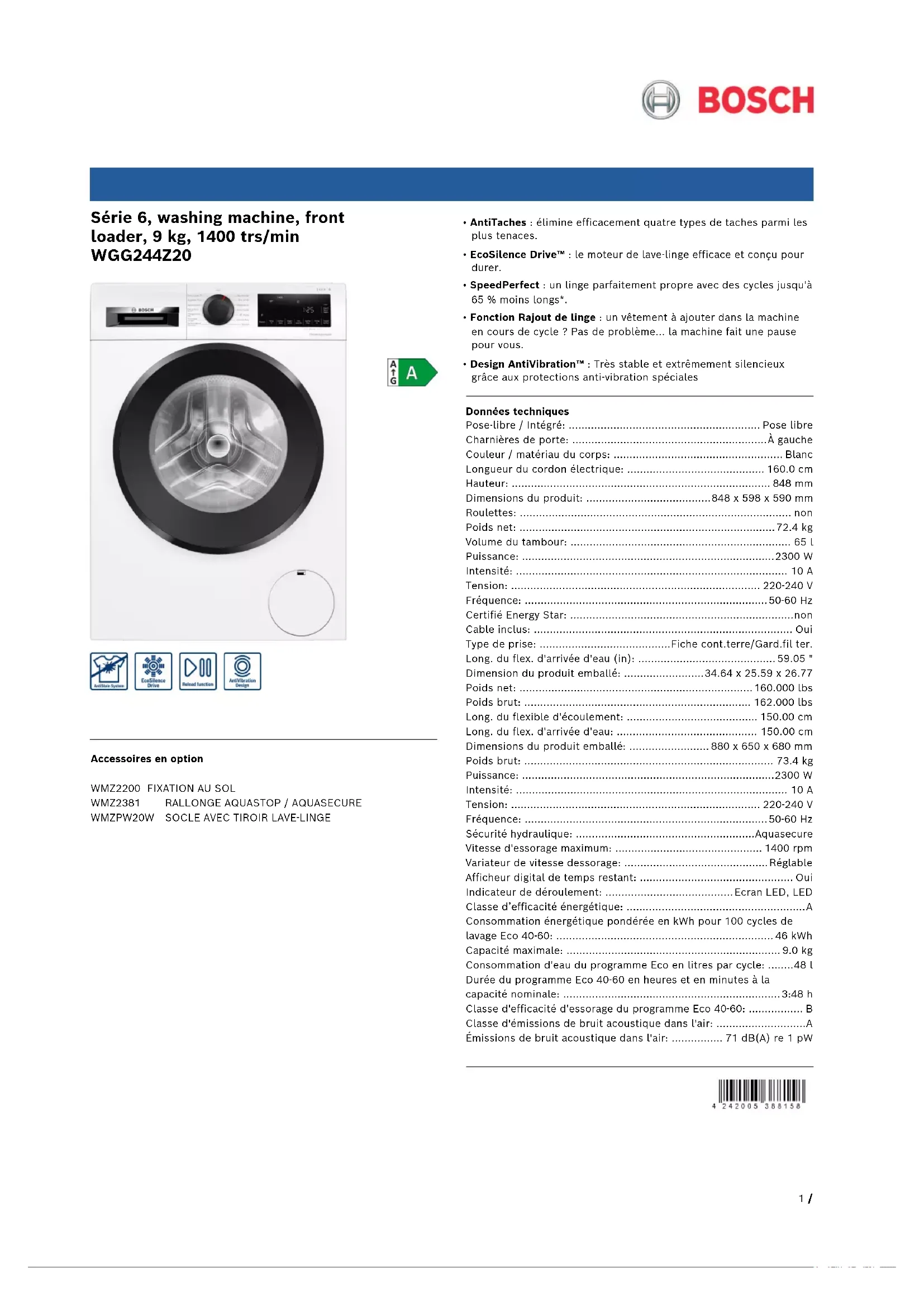 - Design AntiVibration™ : Très stable et extrêmement silencieux grâce aux protections anti-vibration spéciales Données techniques Pose-libre / Intégré: ............................................................ Pose libre Charnières de porte: .............................................................À gauche Couleur / matériau du corps: ..................................................... Blanc Longueur du cordon électrique: ........................................... 160.0 cm Hauteur: ................................................................................. 848 mm Dimensions du produit: .......................................848 x 598 x 590 mm Roulettes: ..................................................................................... non Poids net: ................................................................................72.4 kg Volume du tambour: ..................................................................... 65 l Puissance: ...............................................................................2300 W Intensité: ..................................................................................... 10 A Tension: .............................................................................. 220-240 V Fréquence: ............................................................................ 50-60 Hz Certifié Energy Star: ......................................................................non Cable inclus: ................................................................................. Oui Type de prise: .........................................Fiche cont.terre/Gard.fil ter. Long. du flex. d'arrivée d'eau (in): ........................................... 59.05 " Dimension du produit emballé: .........................34.64 x 25.59 x 26.77 Poids net: .........................................................................160.000 lbs Poids brut: ....................................................................... 162.000 lbs Long. du flexible d'écoulement: ......................................... 150.00 cm Long. du flex. d'arrivée d'eau: ............................................ 150.00 cm Dimensions du produit emballé: ......................... 880 x 650 x 680 mm Poids brut: .............................................................................. 73.4 kg Puissance: ...............................................................................2300 W Intensité: ..................................................................................... 10 A Tension: .............................................................................. 220-240 V Fréquence: ............................................................................ 50-60 Hz Sécurité hydraulique: ........................................................Aquasecure Vitesse d'essorage maximum: .............................................. 1400 rpm Variateur de vitesse dessorage: ............................................. Réglable Afficheur digital de temps restant: ................................................ Oui Indicateur de déroulement: ........................................Ecran LED, LED Classe d’efficacité énergétique: ........................................................A Consommation énergétique pondérée en kWh pour 100 cycles de lavage Eco 40-60: .................................................................... 46 kWh Capacité maximale: ................................................................... 9.0 kg Consommation d'eau du programme Eco en litres par cycle: ........48 l Durée du programme Eco 40-60 en heures et en minutes à la capacité nominale: ....................................................................3:48 h Classe d'efficacité d'essorage du programme Eco 40-60: ................. B Classe d'émissions de bruit acoustique dans l'air: ............................A Émissions de bruit acoustique dans l'air: ................ 71 dB(A) re 1 pW 1 /Série 6, washing machine, front loader, 9 kg, 1400 trs/min WGG244Z20 Caractéristiques principales - Classe d‘efficacité énergétique A sur une échelle allant de A à G¹ - Energie² / Eau³ : 46 kWh / 48 litres - Capacité : 1 à 9 kg - Durée progr. Eco 40-60 charge pleine⁴: 3:48 h - Classe d’efficacité d’essorage : B - Vitesse d‘essorage max : 1400 tr/min** - Niveau sonore essorage : 71 dB (A) re 1 pW - Classe d‘efficacité sonore : A Programmes/Options - Programmes standard: Coton, Synthétiques, Délicat/soie, Laine/lavage à la main. - Programmes spéciaux: Nettoyage tambour, Synthétique, Vidange/Essorage, Mix rapide, Sport/Fitness, Rinçage, Express 30'/15' Options - Mode automatique anti-tache pour 4 taches les plus courantes, activable sur les programmes standards - Touches TouchControl: Repassage facile, Terminé, Taches, Rinçage plus, Départ/Pause/Rajout de linge, Température, Express, Prélavage, Essorage variable/Arrêt cuve pleine Confort/Sécurité - Tambour Vario : soin des textiles garanti - Nettoyage du tambour avec rappel automatique - EcoSilence Drive : Nouveau moteur à induction alliant longévité et stabilité extrême - Design AntiVibration : meilleure stabilité et plus grande tranquillité de marche - Sélecteur électronique soft dial - La fonction Rajout de linge permet de rajouter ou retirer des vêtements en cours de cycle. - Grand écran LED avec affichage clair pour déroulement du cycle, température, vitesse d'essorage max., temps restant, fin différée 24 h et recommandation de chargement - Rajout de linge - ActiveWater Plus : consommation d'eau adaptée, même aux petites charges, grâce à la détection automatique de charge. - Détection mousse - Détection antibalourd - Sécurité enfants - Signal sonore fin de programme - Bac à produit autonettoyant - hublot de 32 cm, black-blackgrey avec angle d'ouverture de porte de 165° - Tuyau AquaStop Caractéristiques techniques - Mise sous plan dans niche 
