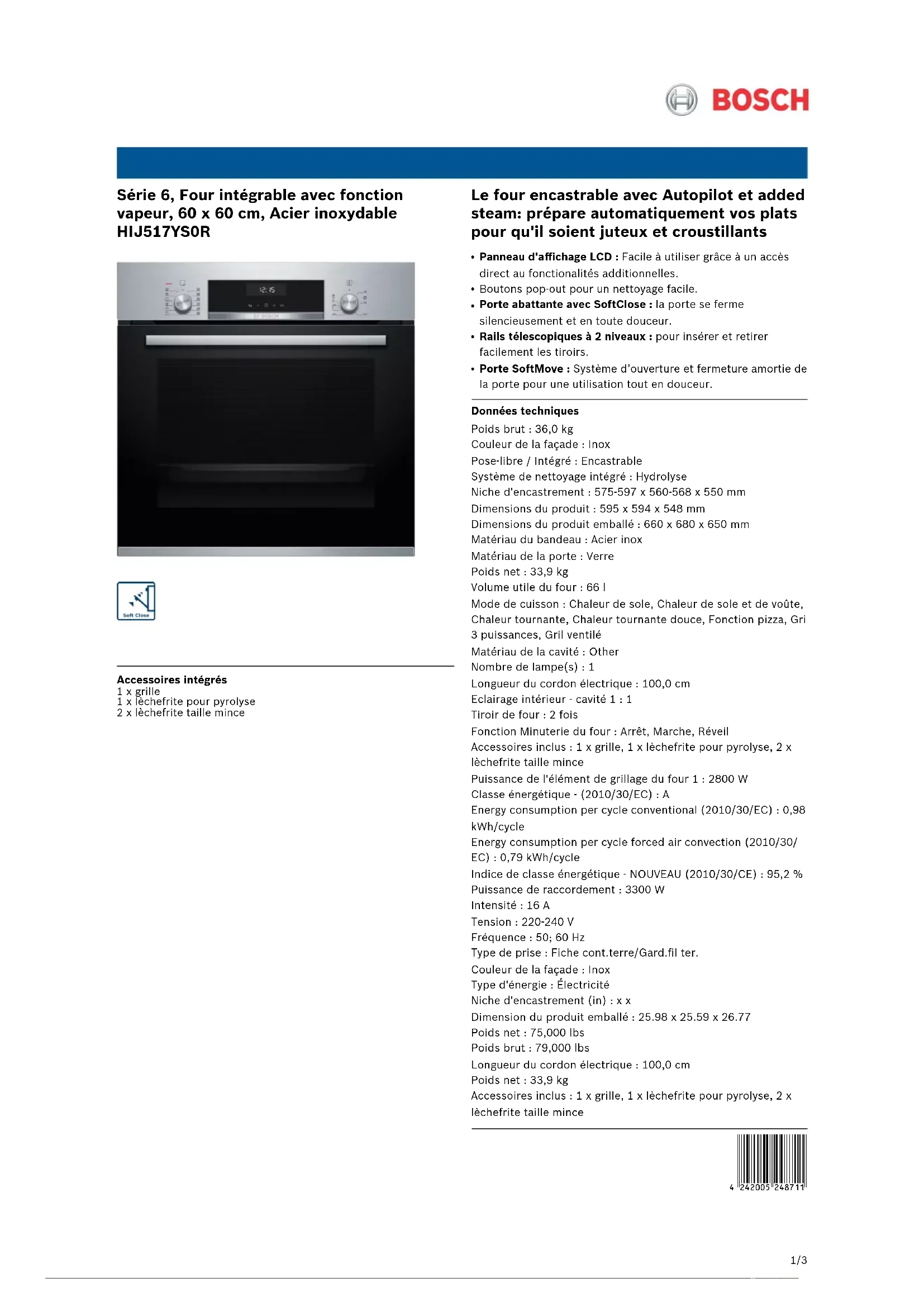 Porte SoftMove : Système d’ouverture et fermeture amortie de la porte pour une utilisation tout en douceur. Données techniques Poids brut : 36,0 kg Couleur de la façade : Inox Pose-libre / Intégré : Encastrable Système de nettoyage intégré : Hydrolyse Niche d'encastrement : 575-597 x 560-568 x 550 mm Dimensions du produit : 595 x 594 x 548 mm Dimensions du produit emballé : 660 x 680 x 650 mm Matériau du bandeau : Acier inox Matériau de la porte : Verre Poids net : 33,9 kg Volume utile du four : 66 l Mode de cuisson : Chaleur de sole, Chaleur de sole et de voûte, Chaleur tournante, Chaleur tournante douce, Fonction pizza, Gril 3 puissances, Gril ventilé Matériau de la cavité : Other Nombre de lampe(s) : 1 Longueur du cordon électrique : 100,0 cm Eclairage intérieur - cavité 1 : 1 Tiroir de four : 2 fois Fonction Minuterie du four : Arrêt, Marche, Réveil Accessoires inclus : 1 x grille, 1 x lèchefrite pour pyrolyse, 2 x lèchefrite taille mince Puissance de l'élément de grillage du four 1 : 2800 W Classe énergétique - (2010/30/EC) : A Energy consumption per cycle conventional (2010/30/EC) : 0,98 kWh/cycle Energy consumption per cycle forced air convection (2010/30/ EC) : 0,79 kWh/cycle Indice de classe énergétique - NOUVEAU (2010/30/CE) : 95,2 % Puissance de raccordement : 3300 W Intensité : 16 A Tension : 220-240 V Fréquence : 50; 60 Hz Type de prise : Fiche cont.terre/Gard.fil ter. Couleur de la façade : Inox Type d'énergie : Électricité Niche d'encastrement (in) : x x Dimension du produit emballé : 25.98 x 25.59 x 26.77 Poids net : 75,000 lbs Poids brut : 79,000 lbs Longueur du cordon électrique : 100,0 cm Poids net : 33,9 kg Accessoires inclus : 1 x grille, 1 x lèchefrite pour pyrolyse, 2 x lèchefrite taille mince '!2E20AF-ceihbb! 1/3Série 6, Four intégrable avec fonction vapeur, 60 x 60 cm, Acier inoxydable