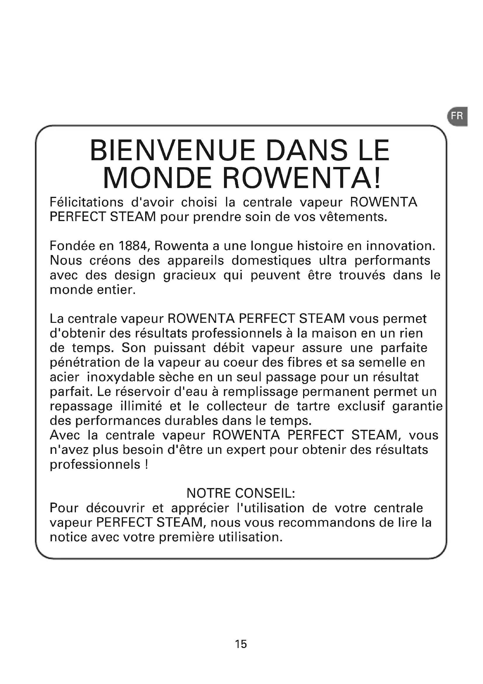 MONDE ROWENTA! Félicitations d'avoir choisi la centrale vapeur ROWENTA PERFECT STEAM pour prendre soin de vos vêtements. Fondée en 1884, Rowenta a une longue histoire en innovation. Nous créons des appareils domestiques ultra performants avec des design gracieux qui peuvent être trouvés dans le monde entier. La centrale vapeur ROWENTA PERFECT STEAM vous permet d'obtenir des résultats professionnels à la maison en un rien de temps. Son puissant débit vapeur assure une parfaite pénétration de la vapeur au coeur des fibres et sa semelle en acier inoxydable sèche en un seul passage pour un résultat parfait. Le réservoir d'eau à remplissage permanent permet un repassage illimité et le collecteur de tartre exclusif garantie des performances durables dans le temps. Avec la centrale vapeur ROWENTA PERFECT STEAM, vous n'avez plus besoin d'être un expert pour obtenir des résultats professionnels ! NOTRE CONSEIL: Pour découvrir et apprécier l'utilisation de votre centrale vapeur PERFECT STEAM, nous vous recommandons de lire la notice avec votre première utilisation. ÊÊÊÊÊ ÊÊÊÊÊÊÊÊÊÊ ÊÊÊÊÊÊÊÊÊÊÊÊÊ ÊÊÊÊÊÊ