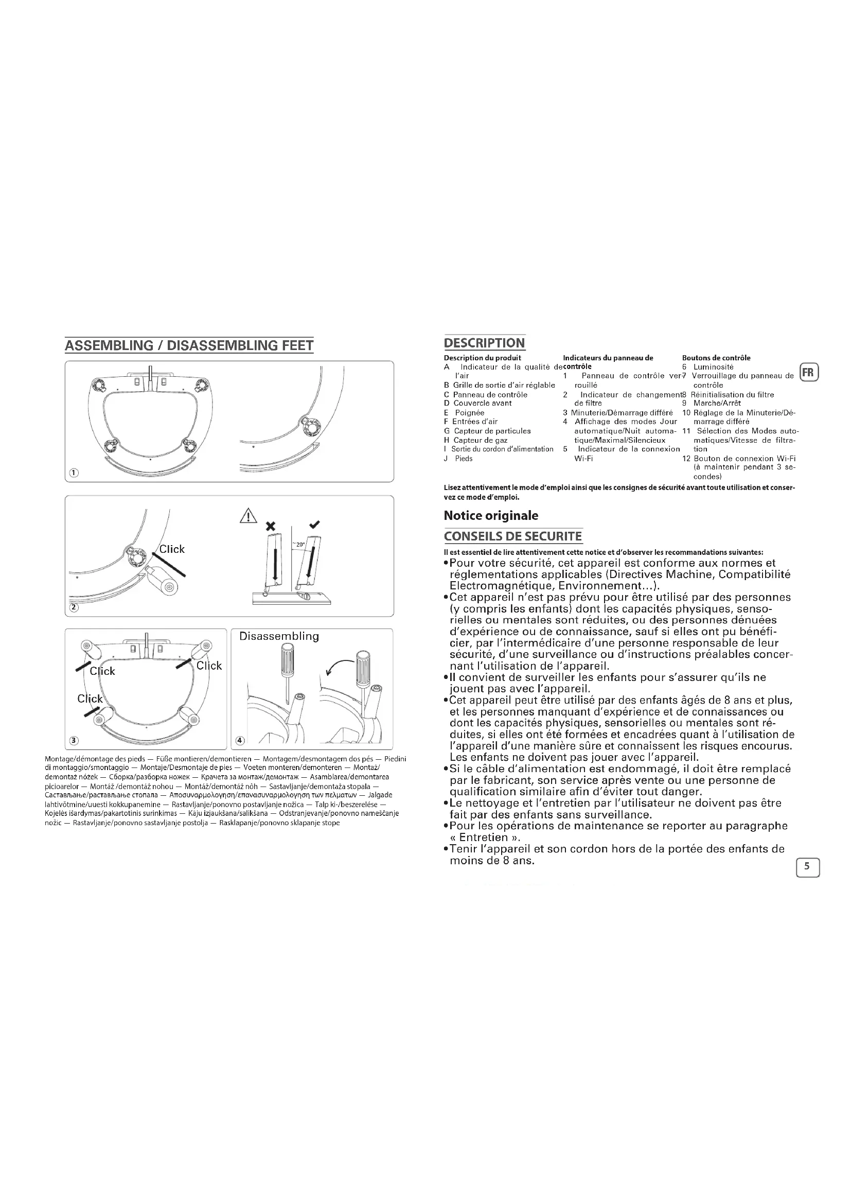 Montage/démontage des pieds — Füße montieren/demontieren — Montagem/desmontagem dos pés — Piedini di montaggio/smontaggio — Montaje/Desmontaje de pies — Voeten monteren/demonteren — Montaż/ demontaż nóżek — Сборка/разборка ножек — Крачета за монтаж/демонтаж — Asamblarea/demontarea picioarelor — Montáž /demontáž nohou — Montáž/demontáž nôh — Sastavljanje/demontaža stopala — Састављање/растављање стопала — Αποσυναρμολογηση/επανασυναρμολογηση των πελματων — Jalgade lahtivõtmine/uuesti kokkupanemine — Rastavljanje/ponovno postavljanje nožica — Talp ki-/beszerelése — Kojelės išardymas/pakartotinis surinkimas — Kāju izjaukšana/salikšana — Odstranjevanje/ponovno nameščanje nožic — Rastavljanje/ponovno sastavljanje postolja — Rasklapanje/ponovno sklapanje stope DESCRIPTION Description du produitA Indicateur de la qualité de l’airB Grille de sortie d’air réglableC Panneau de contrôleD Couvercle avantE PoignéeF Entrées d’airG Capteur de particulesH Capteur de gazI Sortie du cordon d’alimentationJ PiedsIndicateurs du panneau de contrôle1 Panneau de contrôle ver-rouillé2 Indicateur de changement de ltre3 Minuterie/Démarrage différé4 Afchage des modes Jour automatique/Nuit automa-tique/Maximal/Silencieux5 Indicateur de la connexion Wi-FiBoutons de contrôle6 Luminosité7 Verrouillage du panneau de contrôle8 Réinitialisation du ltre9 Marche/Arrêt10 Réglage de la Minuterie/Dé-marrage différé11 Sélection des Modes auto-matiques/Vitesse de filtra- tion 12 Bouton de connexion Wi-Fi (à maintenir pendant 3 se-condes) Lisez attentivement le mode d’emploi ainsi que les consignes de sécurité avant toute utilisation et conser- vez ce mode d’emploi. Notice originale