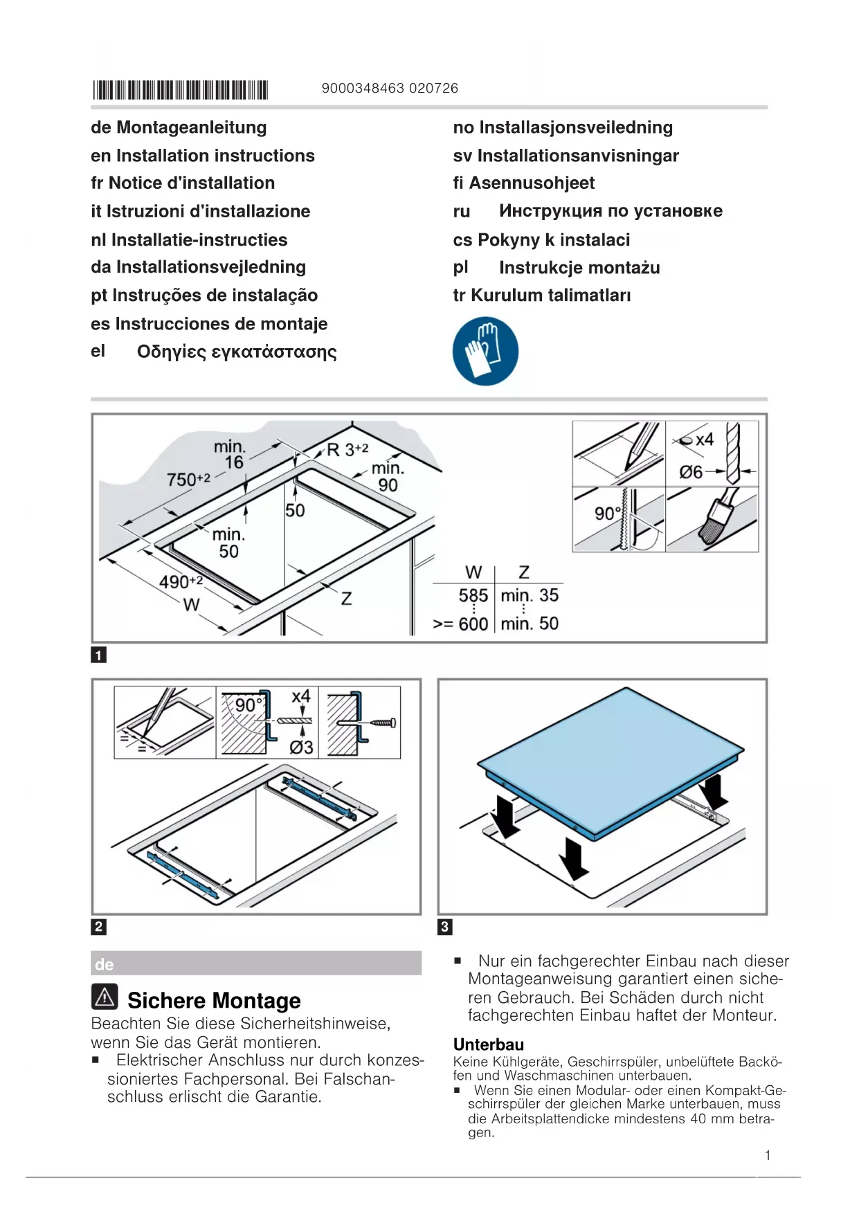 Installation en toute sécurité Respectez les consignes de sécurité lorsque vous installez cet appareil. ¡ Branchement électrique uniquement par un personnel qualifié agréé. Toute erreur de branchement annule la garantie. ¡ Seule une installation effectuée selon les présentes recommandations de montage garantit une utilisation en toute sécurité. L'installateur est responsable en cas de dommages dus à une installation incor- recte. Éléments installés en dessous N'installez aucun réfrigérateur, lave-vaisselle, four non ventilé ou lave-linge en-dessous. ¡ Si vous installez en-dessous un lave-vaisselle mo- dulaire ou compact de la même marque, l'épais- seur du plan de travail doit être d'au moins 40 mm. ¡ Veillez à ce que les parties saillantes, telles que le boîtier d’alimentation ou le câble d’alimentation, n’entrent pas en collision avec un tiroir, par exemple. Plancher intermédiaire Si le dessous de la table de cuisson peut être tou- ché, il est nécessaire de monter un plancher inter- médiaire. ¡ Si vous utilisez votre propre plancher intermé- diaire, la distance minimale par rapport à la prise secteur de l’appareil doit être de 10mm. Préparation du meuble Le plan de travail doit être plat, horizontal et stable. ¡ Les meubles d'encastrement, y compris les plinthes de finition murale, doivent résister à une chaleur d'au moins 90°C. ¡ Un revêtement de niche situé à moins de 50mm de la paroi arrière doit être incombustible (par ex. carrelages, pierre). ¡ Scellez les surfaces de coupe de manière à ce qu'elles résistent à la chaleur, afin d'éviter que l'humidité ne fasse gonfler le plan de travail.