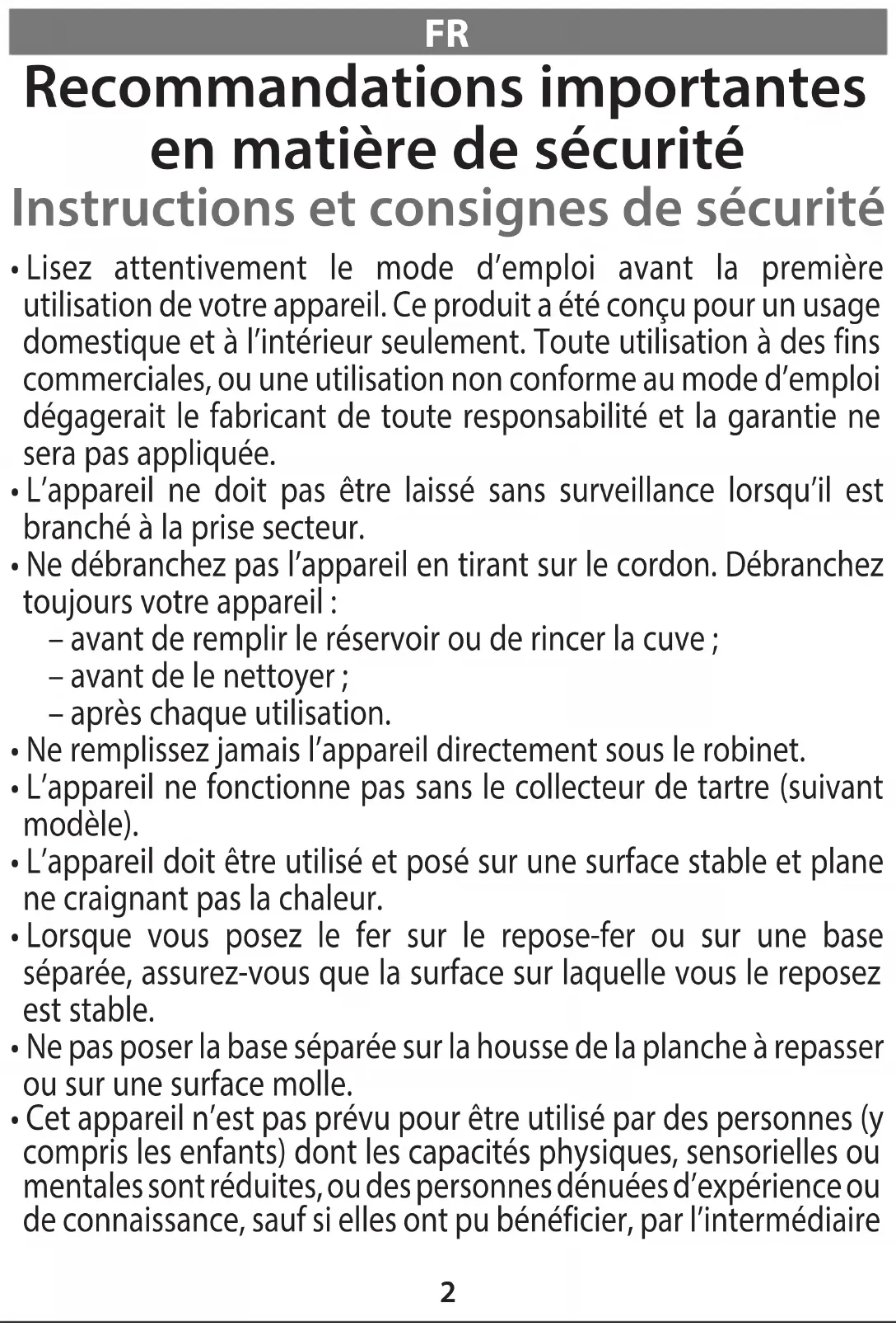 - Votre appareil émet de la vapeur qui peut occasionner des brûlures. – Manipulez le fer avec précaution, surtout en défroissage vertical. – Ne défroissez jamais un vêtement sur une personne mais toujours sur un cintre. – Ne repassez jamais en position assise avec les jambes au-dessous de la planche à repasser. – Ne dirigez jamais la vapeur sur des personnes ou des animaux.