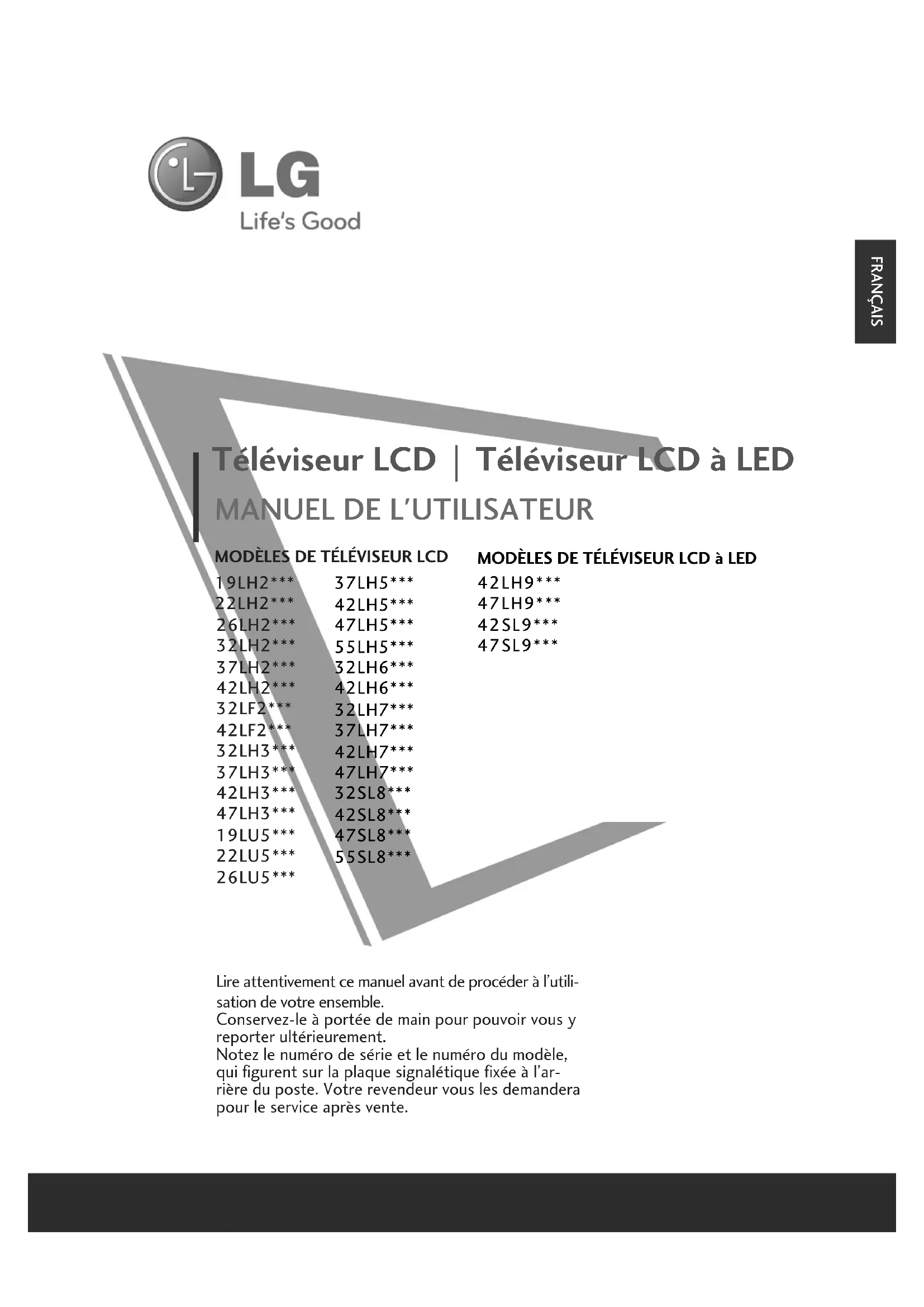 MODÈLES DE TÉLÉVISEUR LCD 1199LLHH22****** 2222LLHH22****** 2266LLHH22****** 3322LLHH22****** 3377LLHH22****** 4422LLHH22****** 3322LLFF22****** 4422LLFF22****** 3322LLHH33****** 3377LLHH33****** 4422LLHH33****** 4477LLHH33****** 1199LLUU55****** 2222LLUU55****** 2266LLUU55****** Téléviseur LCD Lire attentivement ce manuel avant de procéder à l’utili- sation de votre ensemble. Conservez-le à portée de main pour pouvoir vous y reporter ultérieurement. Notez le numéro de série et le numéro du modèle, qui figurent sur la plaque signalétique fixée à l’ar- rière du poste. Votre revendeur vous les demandera pour le service après vente. FRANÇAIS 3377LLHH55****** 4422LLHH55****** 4477LLHH55****** 5555LLHH55****** 3322LLHH66****** 4422LLHH66****** 3322LLHH77****** 3377LLHH77****** 4422LLHH77****** 4477LLHH77****** 3322SSLL88****** 4422SSLL88****** 4477SSLL88****** 5555SSLL88****** MODÈLES DE TÉLÉVISEUR LCD à LED 4422LLHH99****** 4477LLHH99****** 4422SSLL99****** 4477SSLL99****** Téléviseur LCD à LED1 vis pour la fixation du socle (Voir page 23) (Uniquement 26/32/37/42LH2***, 32/42LF2***, 26LU5***, 32/37/42LH3***, 37/42LH5***, 32/42LH6***, 32/37LH7***, 42LH9***) Support de montage mural (à acheter séparément) RW120 (19/22LH2***, 19/22LU5