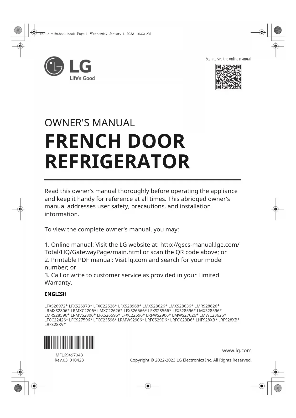 DEUX BATTANTS Read this owner's manual thoroughly before operating the appliance and keep it handy for reference at all times. FRANÇAISLFXS26972* LFXS26973* LFXC22526* LFXS28968* LMXS28626* LMXS28636* LMRS28626* LRMXS2806* LRMXC2206* LMXC22626* LFXS26566* LFXS28566* LFXS28596* LMXS28596* LMRS28596* LRMVS2806* LFXS26596* LFXC22596* LRFWS2906* LMWS27626* LMWC23626* LFCC22426* LFCS27596* LFCC23596* LRMWS2906* LRFCS29D6* LRFCC23D6* LHFS28XB* LRFS28XB* LRFS28XV*www.lg.comCopyright © 2022-2023 LG Electronics Inc. Tous droits réservés Veuillez lire soigneusement le présent manuel d'utilisation avant de faire fonctionner l'appareil et conservez-le à portée de la main pour le consult- er en tout temps. Cette version abrégée traite d'avis sécuritaires pour l'utilisateur, précautions et informations d'installation. Pour consulter le manuel intégral, vous pouvez :