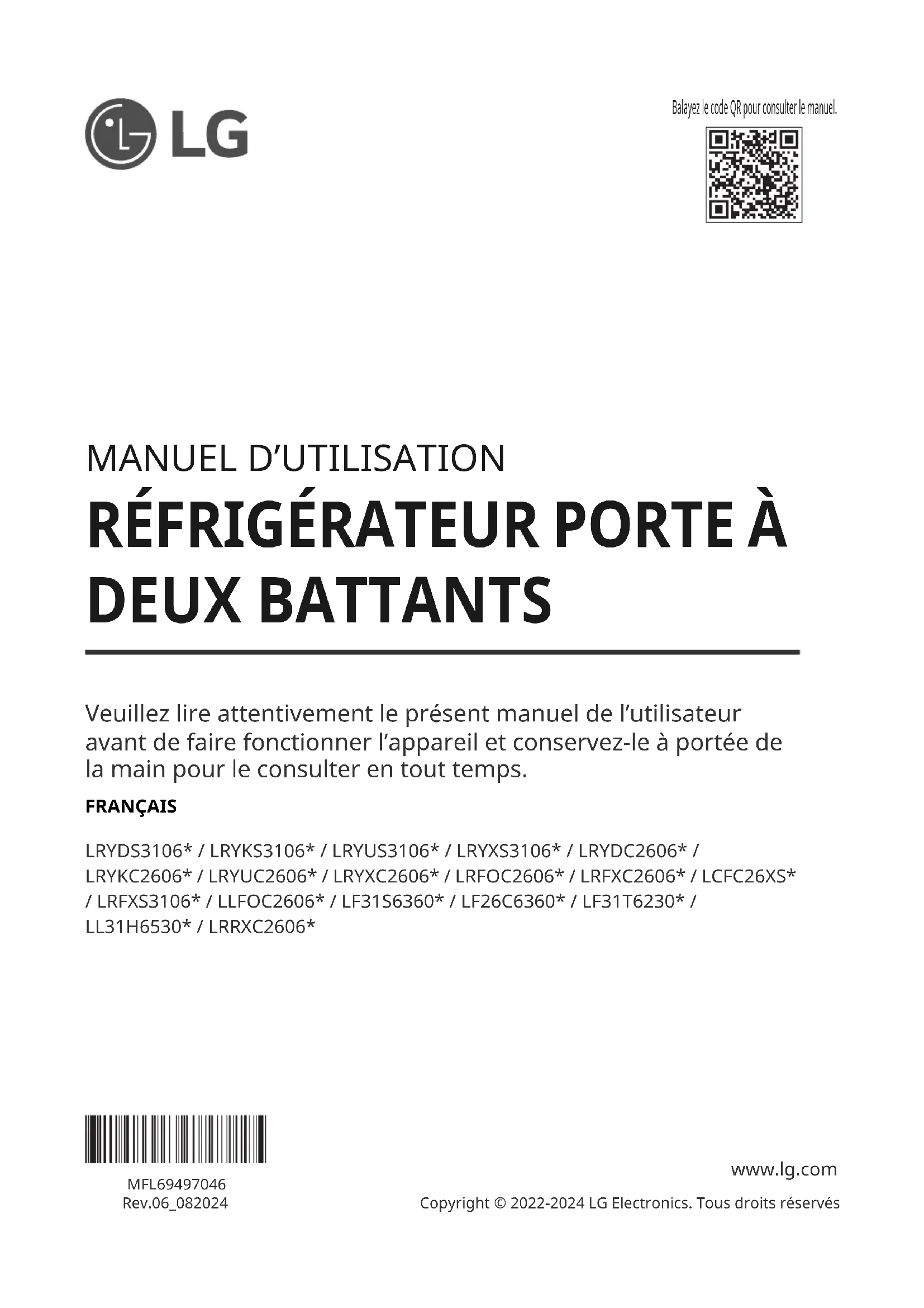 MFL69497046Rev.06_082024 www.lg.com Copyright © 2022-2024 LG Electronics. Tous droits réservés Balayez le code QR pour consulter le manuel.TABLE DES MATIÈRES