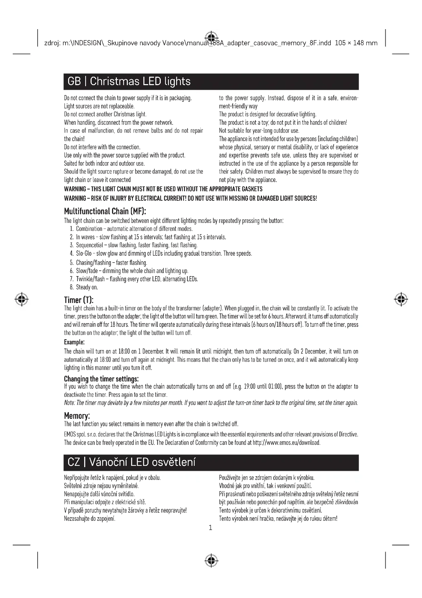 Minuterie (T) : La lumière chaîne a construit -dans minuterie sur le corps de la transformateur (adaptateur). Après la première connexion, la chaîne sera être constamment allumé Après la seconde connexion (vert clair sera la lumière vers le haut), la minuterie va être xée à 6 heures. Après, ça tourne o automatiquement et sera rester hors de 18 heures. La minuterie sera fonctionner automatiquement dans ces intervalles (6 heures sur/18 heures au large) jusqu‘à tourné au large en faisant un troisième contacts. Exemple : La chaîne se tourner sur le 1 Décembre à 18 heures. Il sera reste allumé jusqu‘à minuit, puis se éteint automatiquement. Le 2 Décembre, il se tourner sur automatiquement à 18 heures et tourner de nouveau à minuit. Que des moyens que la chaîne ne doit être mis sur une fois, et il sera automatiquement garder l‘ éclairage de cette façon jusqu‘à ce que vous mettez ce hors. Modication de la minuterie paramètres : Si vous le souhaitez pour changer le moment où la chaîne automatiquement se marche et arrêt (par exemple 19. Heures jusqu‘à 1 heures), tout vous devez faire est tour de la chaîne à la désirée du temps (si il est tourné sur) et puis tourner ce à nouveau. Remarque : la minuterie peut diérer de quelques minutes par mois. Si vous voulez pour régler le tour sur minuterie retour à l‘ origine du temps, réglez la minuterie à nouveau. Mémoire : La dernière fonction sélectionnée reste en mémoire même après la mise hors tension de la chaîne. EMOS spol. s r. o. déclare que les Luminaire de Noël LED est en conformité avec les essentiels exigences et autres pertinentes dispositions de la directive. L‘ appareil peut être utilisé librement dans l‘ UE. La déclaration de conformité peut être trouvé à http://www.emos.eu/download. IT | Luci di Natale con LED Non collegare la catena all‘alimentazione se è contenuta nell‘imballo. Le sorgenti luminose non sono sostituibili. Non collegare un‘altra luce di Natale. Durante la manipolazione, scollegare dalla rete di alimentazione. In caso di malfunzionamento, non rimuovere le lampadine e non riparare la catena! Non interferire con la connessione. Utilizzare solo con la fonte di alimentazione fornita con il prodotto. Adatto sia per interni che per esterni. Se la sorgente luminosa dovesse rompersi o danneggiarsi, non utilizzare la catena leggera o lasciarla collegata all‘alimentazione. Invece, smaltiscilo in modo sicuro e rispettoso dell‘ambiente. Il prodotto è progettato per l’illuminazione decorativa. Il prodotto non è un giocattolo; non metterlo nelle mani dei bambini! Non adatto per uso esterno per tutto l‘anno. Questo apparecchio non è destinato a essere usato da persone (compresi i bambini) la cui disabilità sica, sensoriale o mentale o la mancanza di esperienza e conoscenza impediscono loro l’uso sicuro dell’apparecchio, a meno che non siano supervisionate o istruite sull’uso dell’apparecchio da una persona responsabile della loro sicurezza. È necessario tenere d’occhio i bambini per assicurarsi che non giochino con l’apparecchio. ATTENZIONE – QUESTA CATENA LEGGERA NON DEVE ESSERE UTILIZZATA SENZA LE GUARNIZIONI APPROPRIATE! ATTENZIONE – RISCHIO DI LESIONI PER CORRENTE ELETTRICA! NON UTILIZZARE CON FONTI LUMINOSE MANCANTI O DANNEGGIATE! Catena multifunzionale (MF): La luce catena può essere commutato tra otto di erenti illuminazione modi dal ripetutamente premendo il pulsante: