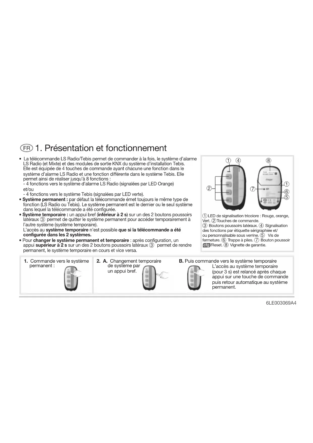 unidirectionnelle ... peut entraîner automatiquement une commande vers le système Tebis KNX 6LE003069A111. S’assurer que la télécommande est apprise à la centrale LS (sinon voir chapitre Apprentissage). 2. Vérifier que la télécommande est dans le système LS par appui supérieur à 2 s sur un des deux boutons poussoirs latéraux 3. La LED 1 doit rester éteinte ou s’éclairer en orange fixe pendant 2 s sinon recommencer l’appui (voir chapitres 1. Présentation et fonctionnement et Fiche d’utilisation).