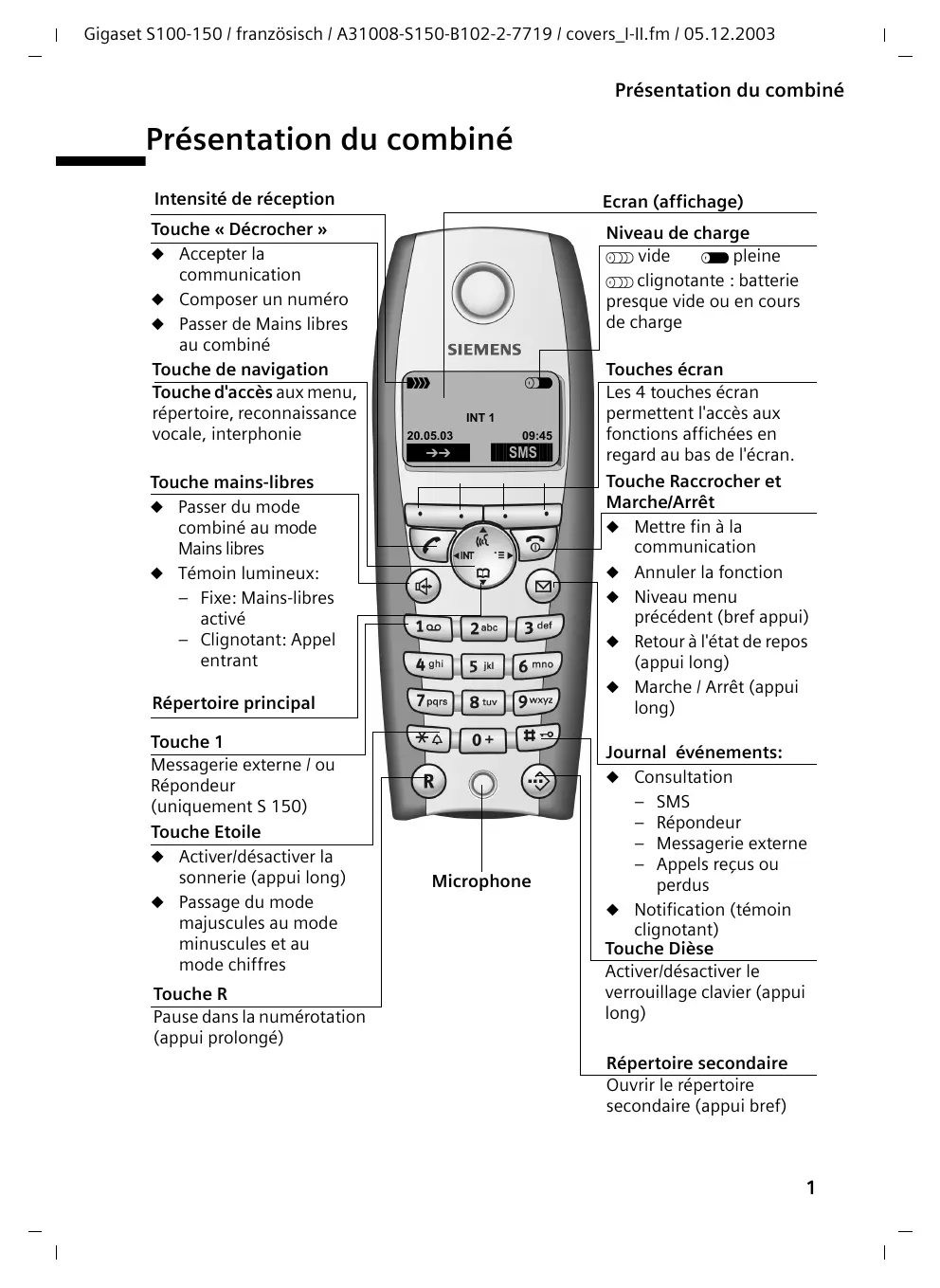 Be inspired Gigaset S100-150 / französisch / A31008-S150-B102-2-7719 / covers_I-II.fm / 05.12.2003 Présentation du combiné Présentation du combiné Intensité de réception Ecran (affichage) Touche « Décrocher » ◆ Accepter la communication ◆ Composer un numéro ◆ Passer de Mains libres au combiné Touche de navigation Touche d'accès aux menu, répertoire, reconnaissance vocale, interphonie Niveau de charge = vide U pleine = clignotante : batterie presque vide ou en cours de charge