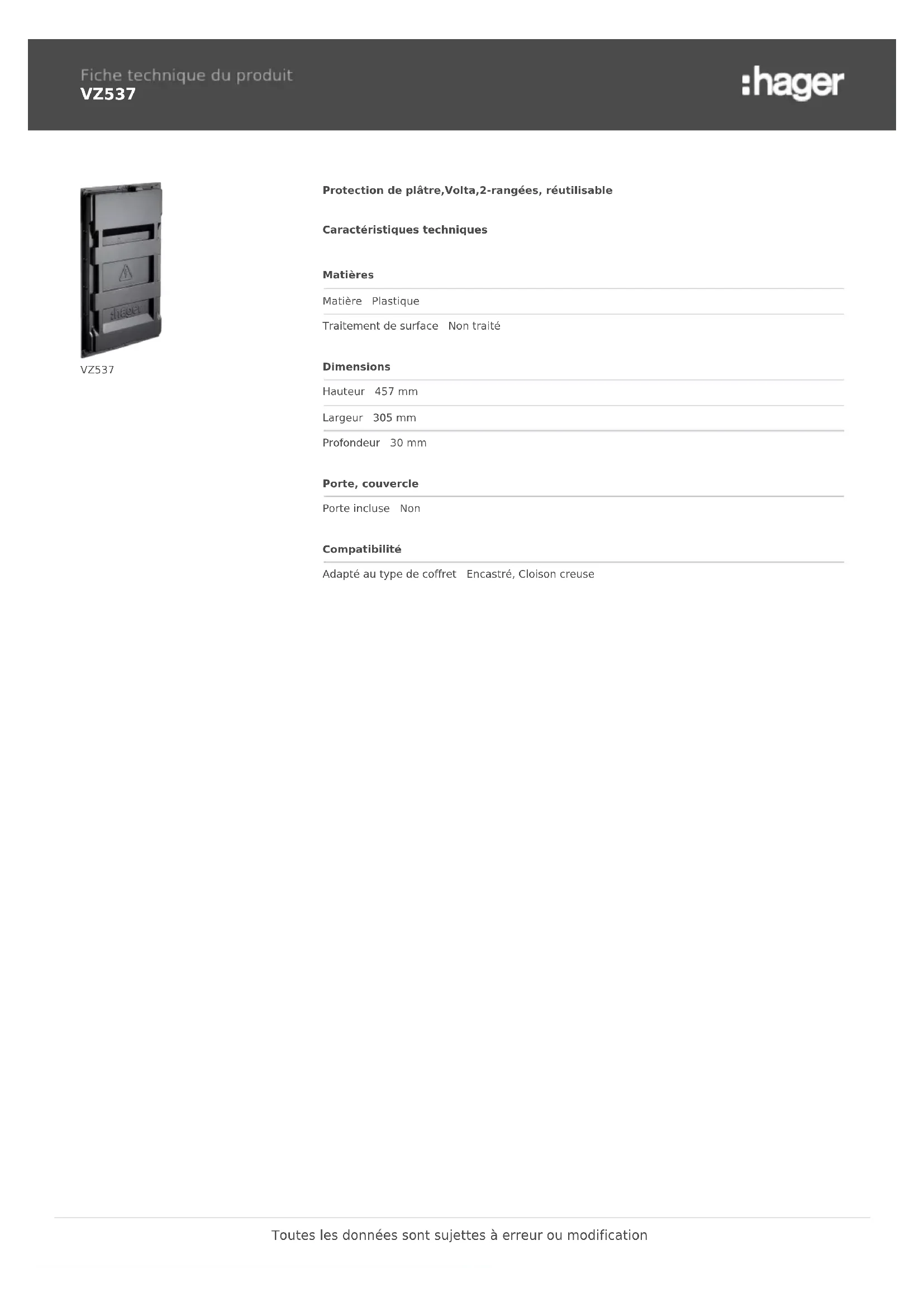 VZ537 VZ537 Protection de plâtre,Volta,2-rangées, réutilisable Caractéristiques techniques Matières Matière Plastique Traitement de surface Non traité Dimensions Hauteur 457 mm Largeur 305 mm Profondeur 30 mm Porte, couvercle Porte incluse Non Compatibilité Adapté au type de coffret Encastré, Cloison creuse Toutes les données sont sujettes à erreur ou modification