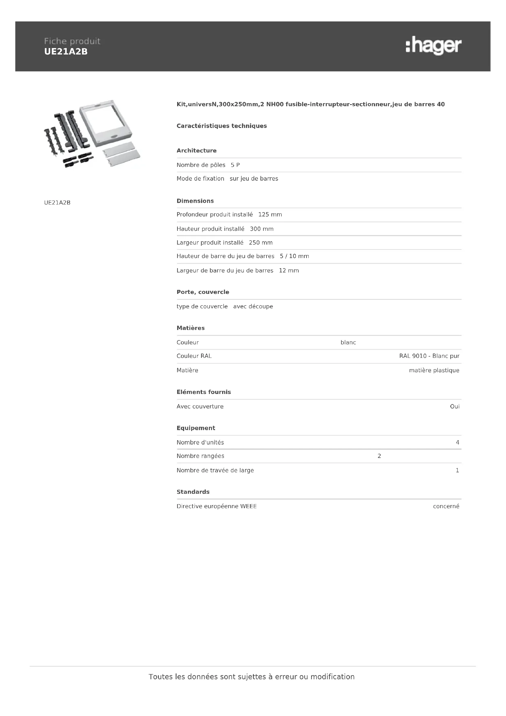 UE21A2B UE21A2B Kit,universN,300x250mm,2 NH00 fusible-interrupteur-sectionneur,jeu de barres 40 Caractéristiques techniques Architecture Nombre de pôles 5 P Mode de fixation sur jeu de barres Dimensions Profondeur produit installé 125 mm Hauteur produit installé 300 mm Largeur produit installé 250 mm Hauteur de barre du jeu de barres 5 / 10 mm Largeur de barre du jeu de barres 12 mm Porte, couvercle type de couvercle avec découpe Matières Couleur blanc Couleur RAL RAL 9010 - Blanc pur Matière matière plastique Eléments fournis Avec couverture Oui Equipement Nombre d'unités 4 Nombre rangées 2 Nombre de travée de large 1 Standards Directive européenne WEEE concerné Toutes les données sont sujettes à erreur ou modification