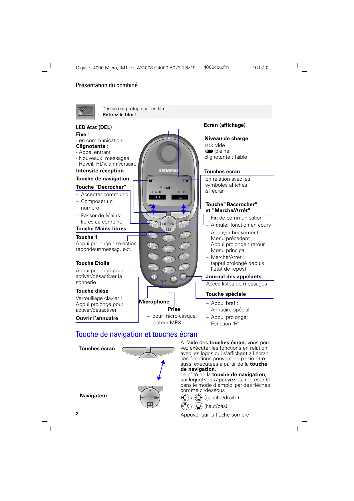 FRANÇAIIS et consignes de sécurité Présentation du combiné Présentation du combiné L’écran est protégé par un film. Retirez le film ! Ecran (affichage) LED état (DEL) Fixe : - en communication Clignotante : - Appel entrant - Nouveaux messages - Réveil, RDV, anniversaire Intensité réception Niveau de charge vide pleine clignotante : faible Touche de navigation