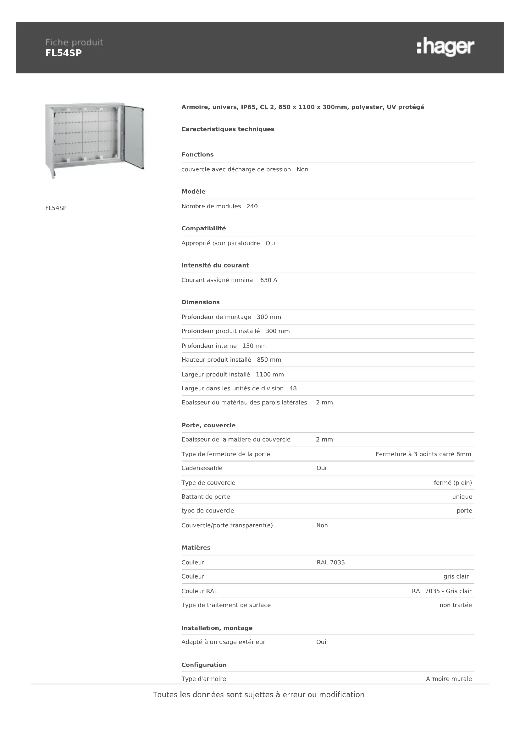 FL54SP FL54SP Armoire, univers, IP65, CL 2, 850 x 1100 x 300mm, polyester, UV protégé Caractéristiques techniques Fonctions couvercle avec décharge de pression Non Modèle Nombre de modules 240 Compatibilité Approprié pour parafoudre Oui Intensité du courant Courant assigné nominal 630 A Dimensions Profondeur de montage 300 mm Profondeur produit installé 300 mm Profondeur interne 150 mm Hauteur produit installé 850 mm Largeur produit installé 1100 mm Largeur dans les unités de division 48 Epaisseur du matériau des parois latérales 2 mm Porte, couvercle Epaisseur de la matière du couvercle 2 mm Type de fermeture de la porte Fermeture à 3 points carré 8mm Cadenassable Oui Type de couvercle fermé (plein) Battant de porte unique type de couvercle porte Couvercle/porte transparent(e) Non Matières Couleur RAL 7035 Couleur gris clair Couleur RAL RAL 7035 - Gris clair Type de traitement de surface non traitée Installation, montage Adapté à un usage extérieur Oui Configuration Type d'armoire Armoire murale Toutes les données sont sujettes à erreur ou modificationEquipement Nombre rangées 5 Nombre de travée de large 4 Nombre de clés 1 Nombre d'ouvertures pour plaques à bride 0 Extension possible Non Standards Directive européenne WEEE non concerné Sécurité Classe de protection classe II Préservation de la fonction - Toutes les données sont sujettes à erreur ou modification