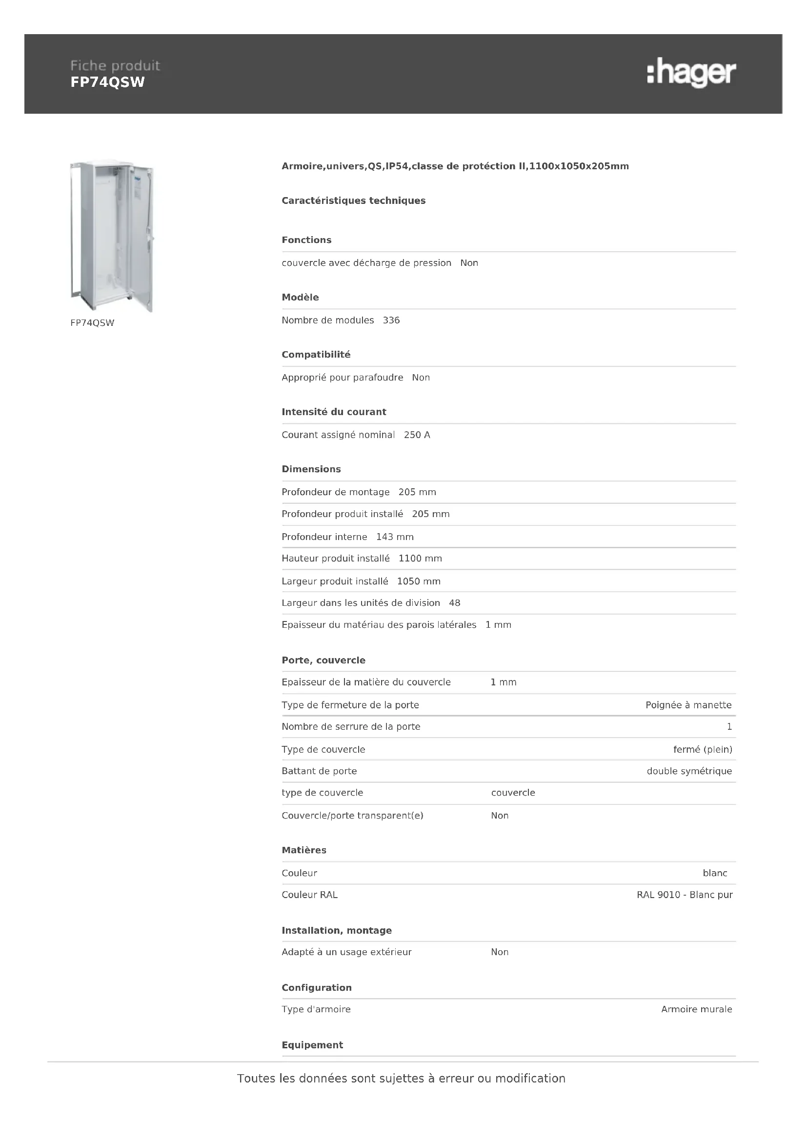 FP74QSW FP74QSW Armoire,univers,QS,IP54,classe de protéction II,1100x1050x205mm Caractéristiques techniques Fonctions couvercle avec décharge de pression Non Modèle Nombre de modules 336 Compatibilité Approprié pour parafoudre Non Intensité du courant Courant assigné nominal 250 A Dimensions Profondeur de montage 205 mm Profondeur produit installé 205 mm Profondeur interne 143 mm Hauteur produit installé 1100 mm Largeur produit installé 1050 mm Largeur dans les unités de division 48 Epaisseur du matériau des parois latérales 1 mm Porte, couvercle Epaisseur de la matière du couvercle 1 mm Type de fermeture de la porte Poignée à manette Nombre de serrure de la porte 1 Type de couvercle fermé (plein) Battant de porte double symétrique type de couvercle couvercle Couvercle/porte transparent(e) Non Matières Couleur blanc Couleur RAL RAL 9010 - Blanc pur Installation, montage Adapté à un usage extérieur Non Configuration Type d'armoire Armoire murale Equipement Toutes les données sont sujettes à erreur ou modificationNombre rangées 7 Nombre de travée de large 4 Nombre de clés 1 Nombre d'ouvertures pour plaques à bride 8 Extension possible Oui Standards Directive européenne WEEE non concerné Sécurité Classe de protection classe II Préservation de la fonction - Toutes les données sont sujettes à erreur ou modification