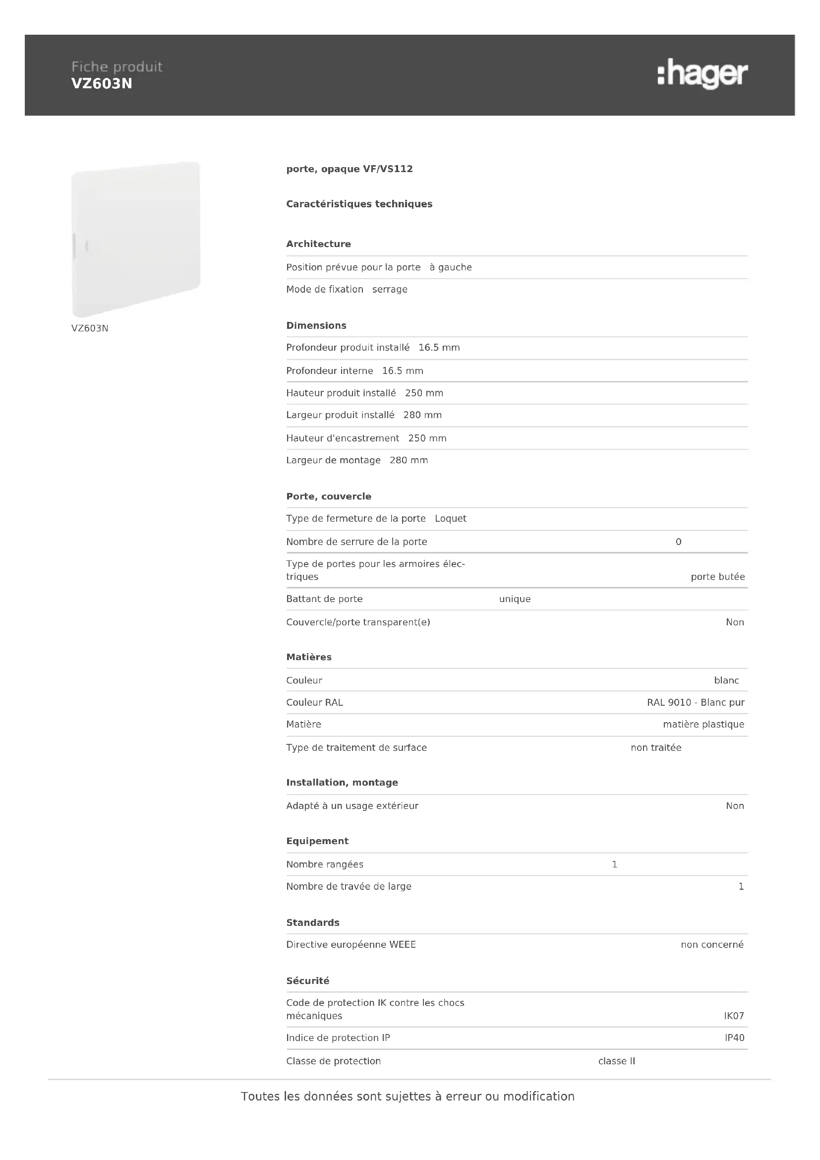 VZ603N VZ603N porte, opaque VF/VS112 Caractéristiques techniques Architecture Position prévue pour la porte à gauche Mode de fixation serrage Dimensions Profondeur produit installé 16.5 mm Profondeur interne 16.5 mm Hauteur produit installé 250 mm Largeur produit installé 280 mm Hauteur d'encastrement 250 mm Largeur de montage 280 mm Porte, couvercle Type de fermeture de la porte Loquet Nombre de serrure de la porte 0 Type de portes pour les armoires élec‐ triques porte butée Battant de porte unique Couvercle/porte transparent(e) Non Matières Couleur blanc Couleur RAL RAL 9010 - Blanc pur Matière matière plastique Type de traitement de surface non traitée Installation, montage Adapté à un usage extérieur Non Equipement Nombre rangées 1 Nombre de travée de large 1 Standards Directive européenne WEEE non concerné Sécurité Code de protection IK contre les chocs mécaniques IK07 Indice de protection IP IP40 Classe de protection classe II Toutes les données sont sujettes à erreur ou modificationSans halogène Oui Conditions d'utilisation Température de service -25…40 °C Toutes les données sont sujettes à erreur ou modification