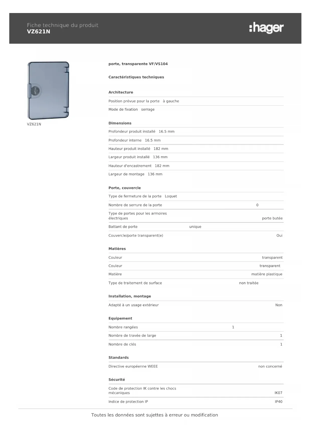 VZ621N VZ621N porte, transparente VF/VS104 Caractéristiques techniques Architecture Position prévue pour la porte à gauche Mode de fixation serrage Dimensions Profondeur produit installé 16.5 mm Profondeur interne 16.5 mm Hauteur produit installé 182 mm Largeur produit installé 136 mm Hauteur d'encastrement 182 mm Largeur de montage 136 mm Porte, couvercle Type de fermeture de la porte Loquet Nombre de serrure de la porte 0 Type de portes pour les armoires électriques porte butée Battant de porte unique Couvercle/porte transparent(e) Oui Matières Couleur transparent Couleur transparent Matière matière plastique Type de traitement de surface non traitée Installation, montage Adapté à un usage extérieur Non Equipement Nombre rangées 1 Nombre de travée de large 1 Nombre de clés 1 Standards Directive européenne WEEE non concerné Sécurité Code de protection IK contre les chocs mécaniques IK07 Indice de protection IP IP40 Toutes les données sont sujettes à erreur ou modificationClasse de protection classe II Sans halogène Oui Conditions d'utilisation Température de service -25…40 °C Toutes les données sont sujettes à erreur ou modification