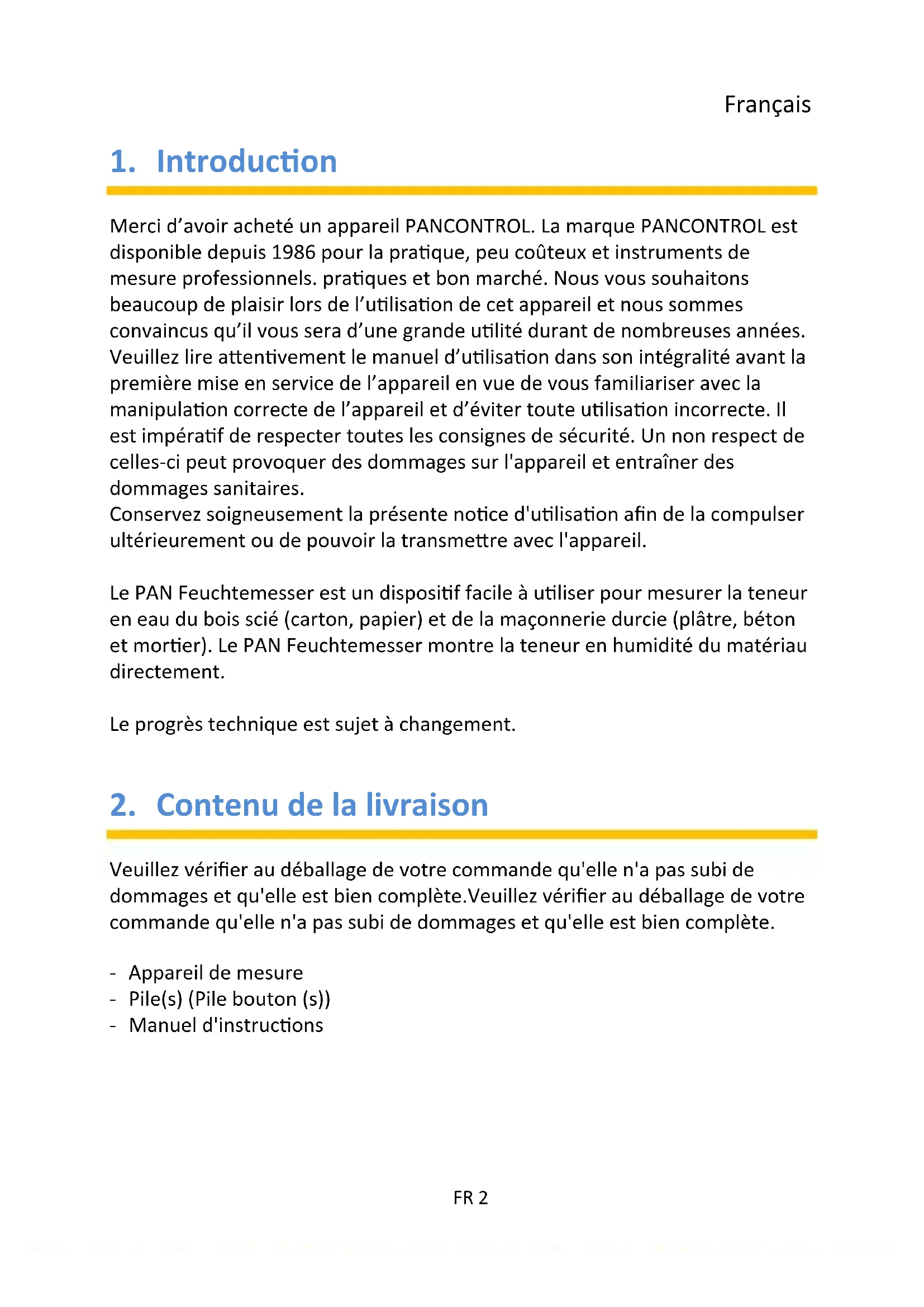 Merci d’avoir acheté un appareil PANCONTROL. La marque PANCONTROL est disponible depuis 1986 pour la pratique, peu coûteux et instruments de mesure professionnels. pratiques et bon marché. Nous vous souhaitons beaucoup de plaisir lors de l’utilisation de cet appareil et nous sommes convaincus qu’il vous sera d’une grande utilité durant de nombreuses années. Veuillez lire attentivement le manuel d’utilisation dans son intégralité avant la première mise en service de l’appareil en vue de vous familiariser avec la manipulation correcte de l’appareil et d’éviter toute utilisation incorrecte. Il est impératif de respecter toutes les consignes de sécurité. Un non respect de celles-ci peut provoquer des dommages sur l'appareil et entraîner des dommages sanitaires. Conservez soigneusement la présente notice d'utilisation afin de la compulser ultérieurement ou de pouvoir la transmettre avec l'appareil. Le PAN Feuchtemesser est un dispositif facile à utiliser pour mesurer la teneur en eau du bois scié (carton, papier) et de la maçonnerie durcie (plâtre, béton et mortier). Le PAN Feuchtemesser montre la teneur en humidité du matériau directement. Le progrès technique est sujet à changement.