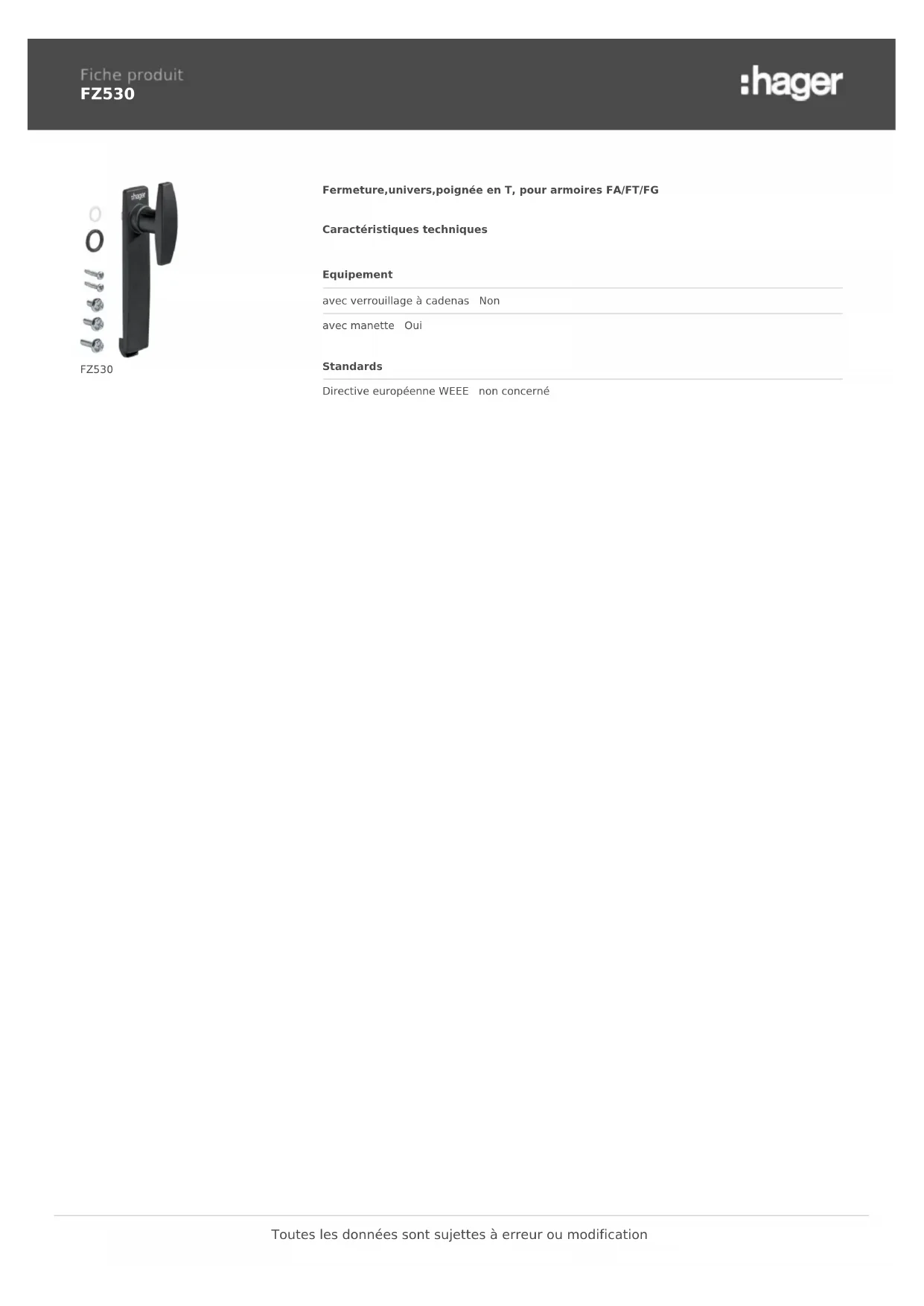 FZ530 FZ530 Fermeture,univers,poignée en T, pour armoires FA/FT/FG Caractéristiques techniques Equipement avec verrouillage à cadenas Non avec manette Oui Standards Directive européenne WEEE non concerné Toutes les données sont sujettes à erreur ou modification