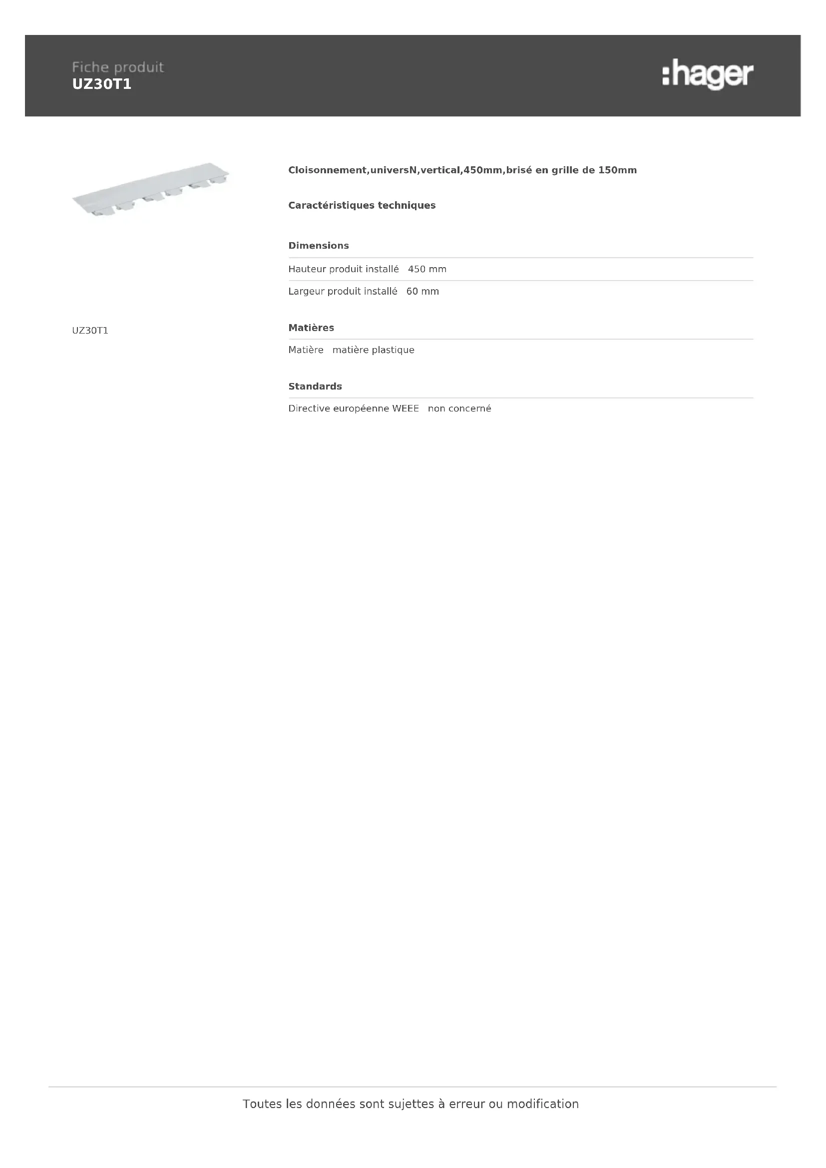 UZ30T1 UZ30T1 Cloisonnement,universN,vertical,450mm,brisé en grille de 150mm Caractéristiques techniques Dimensions Hauteur produit installé 450 mm Largeur produit installé 60 mm Matières Matière matière plastique Standards Directive européenne WEEE non concerné Toutes les données sont sujettes à erreur ou modification
