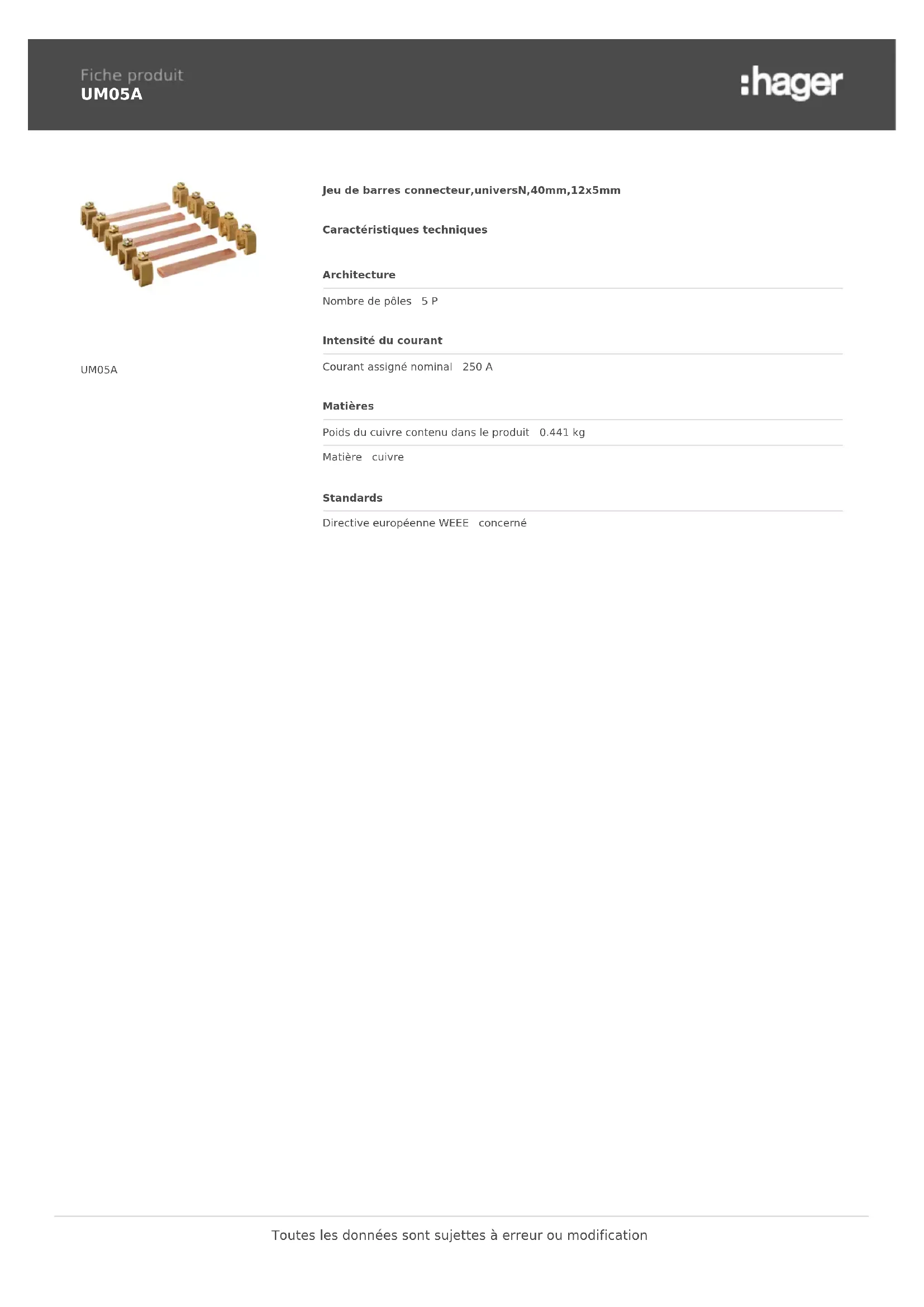 UM05A UM05A Jeu de barres connecteur,universN,40mm,12x5mm Caractéristiques techniques Architecture Nombre de pôles 5 P Intensité du courant Courant assigné nominal 250 A Matières Poids du cuivre contenu dans le produit 0.441 kg Matière cuivre Standards Directive européenne WEEE concerné Toutes les données sont sujettes à erreur ou modification