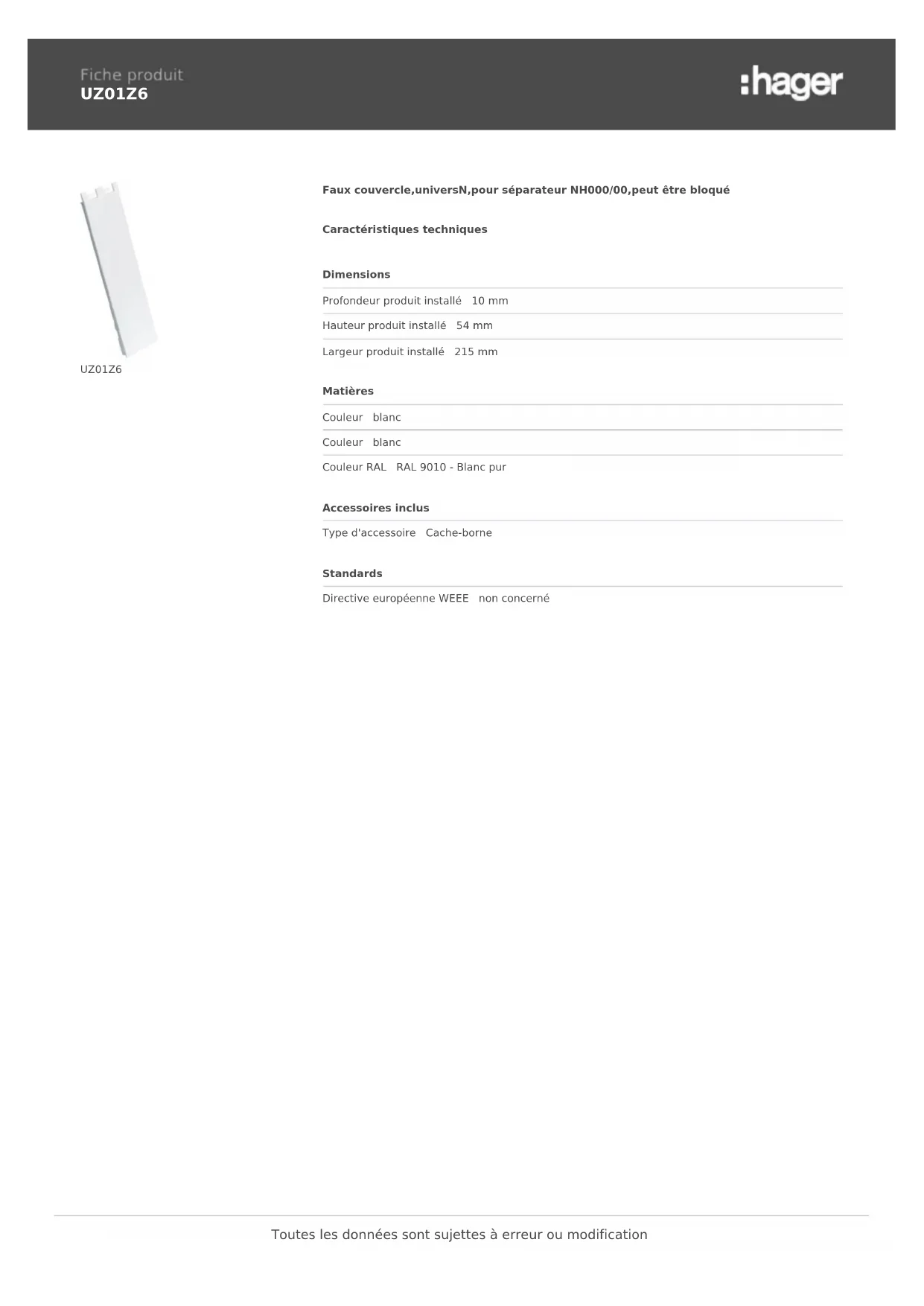 UZ01Z6 UZ01Z6 Faux couvercle,universN,pour séparateur NH000/00,peut être bloqué Caractéristiques techniques Dimensions Profondeur produit installé 10 mm Hauteur produit installé 54 mm Largeur produit installé 215 mm Matières Couleur blanc Couleur blanc Couleur RAL RAL 9010 - Blanc pur Accessoires inclus Type d'accessoire Cache-borne Standards Directive européenne WEEE non concerné Toutes les données sont sujettes à erreur ou modification