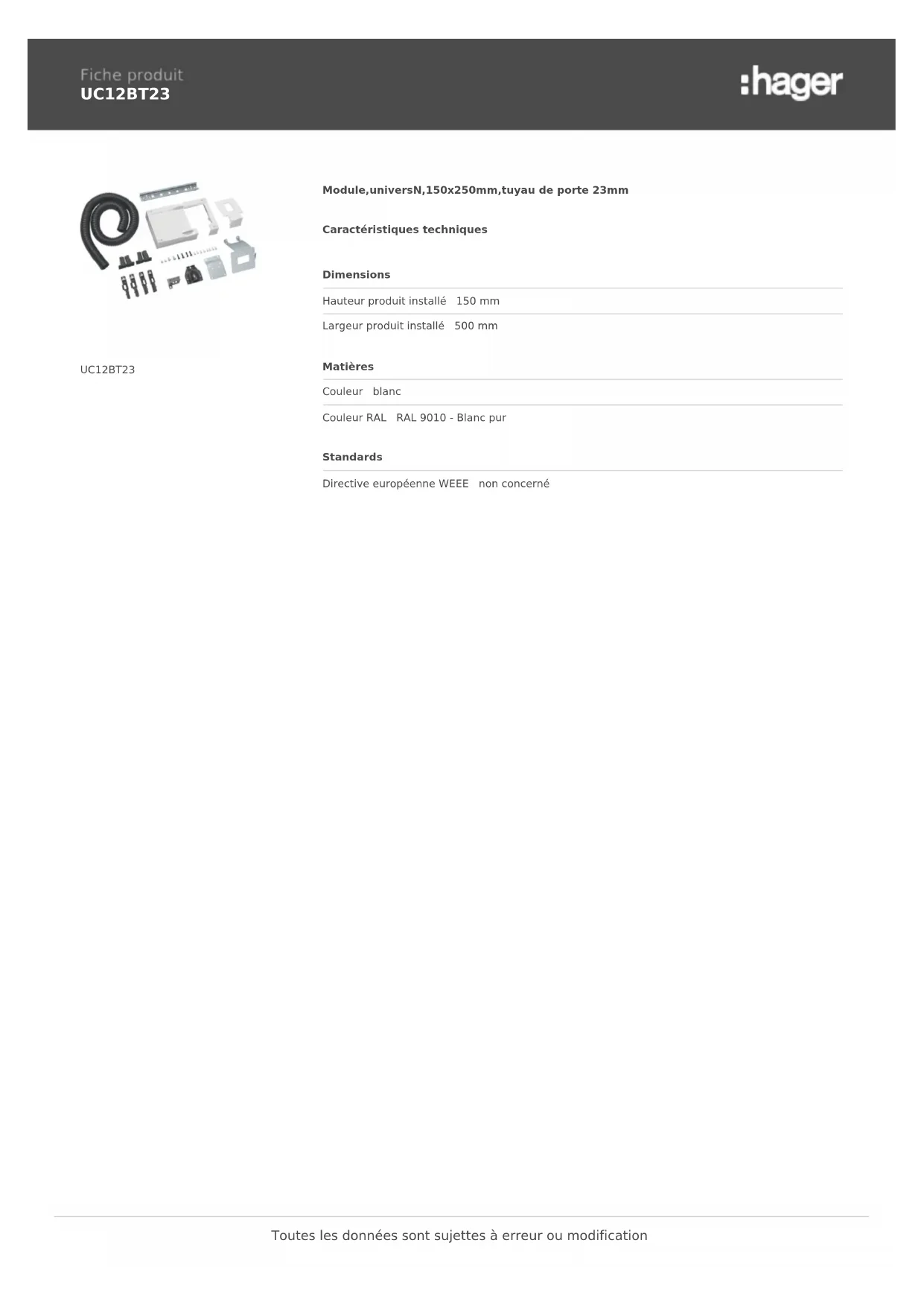 UC12BT23 UC12BT23 Module,universN,150x250mm,tuyau de porte 23mm Caractéristiques techniques Dimensions Hauteur produit installé 150 mm Largeur produit installé 500 mm Matières Couleur blanc Couleur RAL RAL 9010 - Blanc pur Standards Directive européenne WEEE non concerné Toutes les données sont sujettes à erreur ou modification