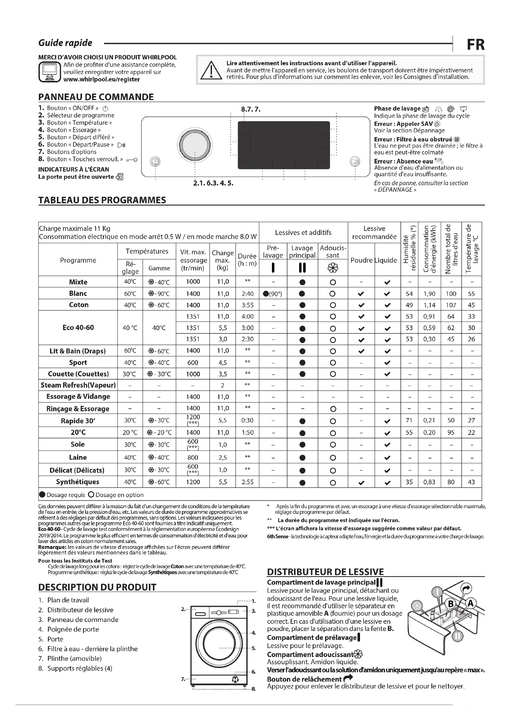 Guide rapide MERCI D’AVOIR CHOISI UN PRODUIT WHIRLPOOLAn de proter d’une assistance complète, veuillez enregistrer votre appareil sur www.whirlpool.eu/registerLire attentivement les instructions avant d’utiliser l’appareil.Avant de mettre l’appareil en service, les boulons de transport doivent être impérativement retirés. Pour plus d’informations sur comment les enlever, voir les Consignes d’installation.