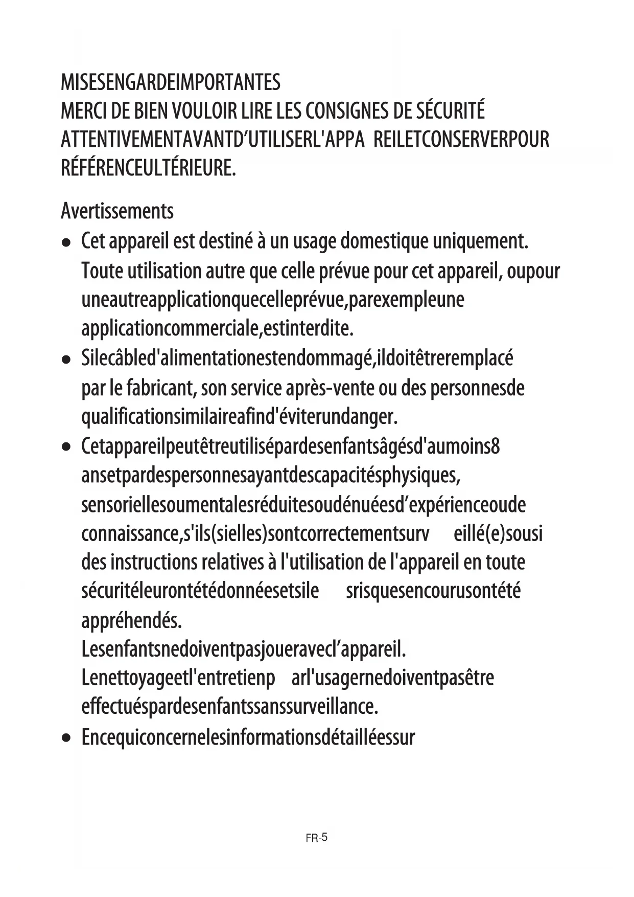 ensoriell es ou mentales réduites ou dénuées d’expérie nce ou de connaiss a nce, s'ils (si elles) sont correctement surv eillé(e) s ou si des instruct ions relatives à l' u tilisation de l'apparei l en toute sécurité leur ont été do nnées et si le s risques encourus ont été appréhendés. Les enfant s ne doivent pas jouer avec l’apparei l. Le nettoyage et l'entr etien p ar l'usager ne d o i vent pas être effec tués par de s e nfants sans surveillance.