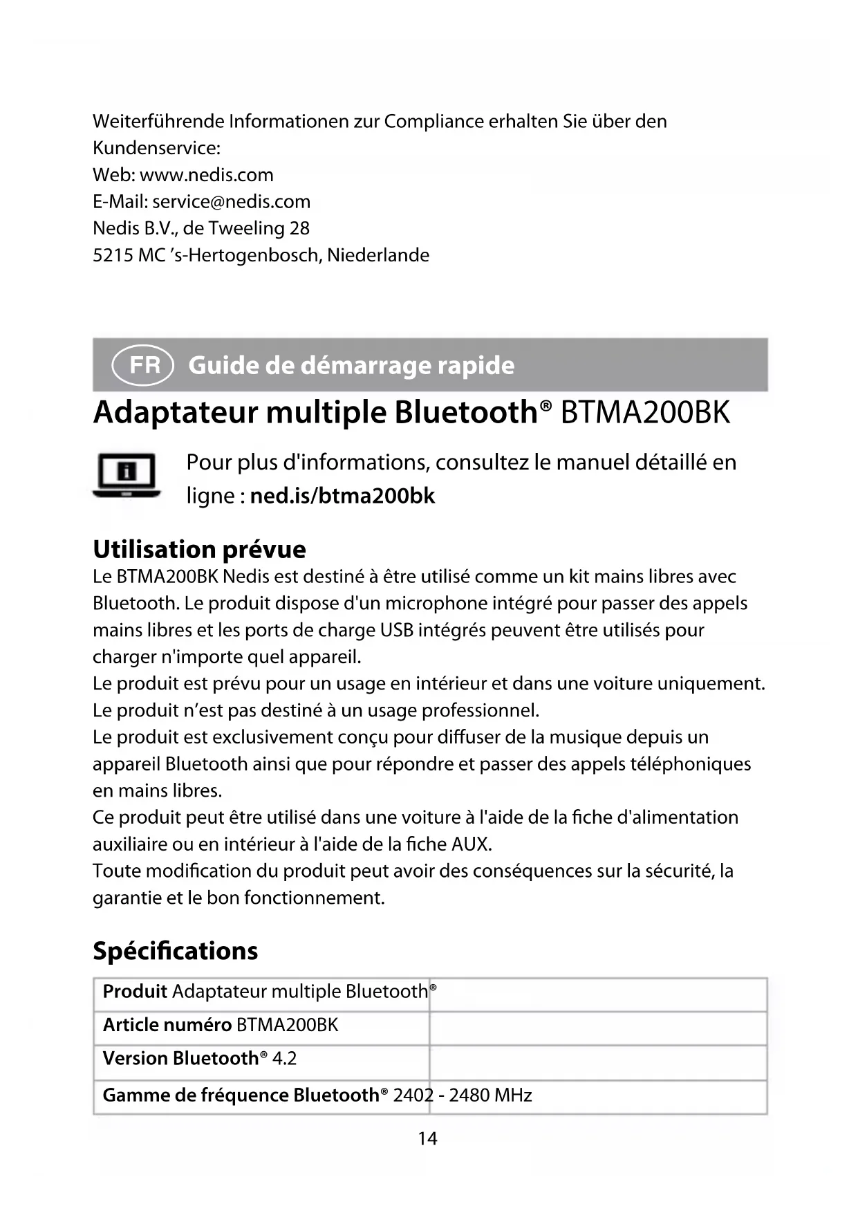 Guide de démarrage rapide Adaptateur multiple Bluetooth® BTMA200BK Pour plus d'informations, consultez le manuel détaillé en ligne : ned.is/btma200bk Utilisation prévue Le BTMA200BK Nedis est destiné à être utilisé comme un kit mains libres avec Bluetooth. Le produit dispose d'un microphone intégré pour passer des appels mains libres et les ports de charge USB intégrés peuvent être utilisés pour charger n'importe quel appareil. Le produit est prévu pour un usage en intérieur et dans une voiture uniquement. Le produit n’est pas destiné à un usage professionnel. Le produit est exclusivement conçu pour diffuser de la musique depuis un appareil Bluetooth ainsi que pour répondre et passer des appels téléphoniques en mains libres. Ce produit peut être utilisé dans une voiture à l'aide de la fiche d'alimentation auxiliaire ou en intérieur à l'aide de la fiche AUX. Toute modification du produit peut avoir des conséquences sur la sécurité, la garantie et le bon fonctionnement. Spécications Produit Adaptateur multiple Bluetooth® Article numéro BTMA200BK Version Bluetooth® 4.2 Gamme de fréquence Bluetooth® 2402 - 2480 MHz15 Puissance de transmission maximale 4 dBm Appel mains libres Oui Microphone intégré Oui Temps de lecture maxi de la batterie (volume à 50 %) Jusqu'à 7 heures Autonomie maximum de la batterie en conversation Jusqu'à 5,5 heures Temps de recharge Jusqu'à 2 heures Type de batterie Lithium-Polymère Capacité de la batterie 300 mAh Sortie de charge USB 2 x 5.0 V / 2,4 A Connexions Entrée AUX Pièces principales (image A)
