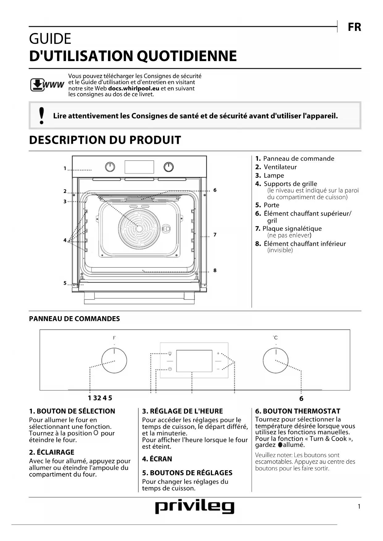 Lire attentivement les Consignes de santé et de sécurité avant d'utiliser l'appareil. WWW Vous pouvez télécharger les Consignes de sécurité et le Guide d'utilisation et d'entretien en visitant notre site Web docs.whirlpool. eu et en suivant les consignes au dos de ce livret.2 CONVECTION NATURELLE Pour cuire tout type de plat sur une seule grille.