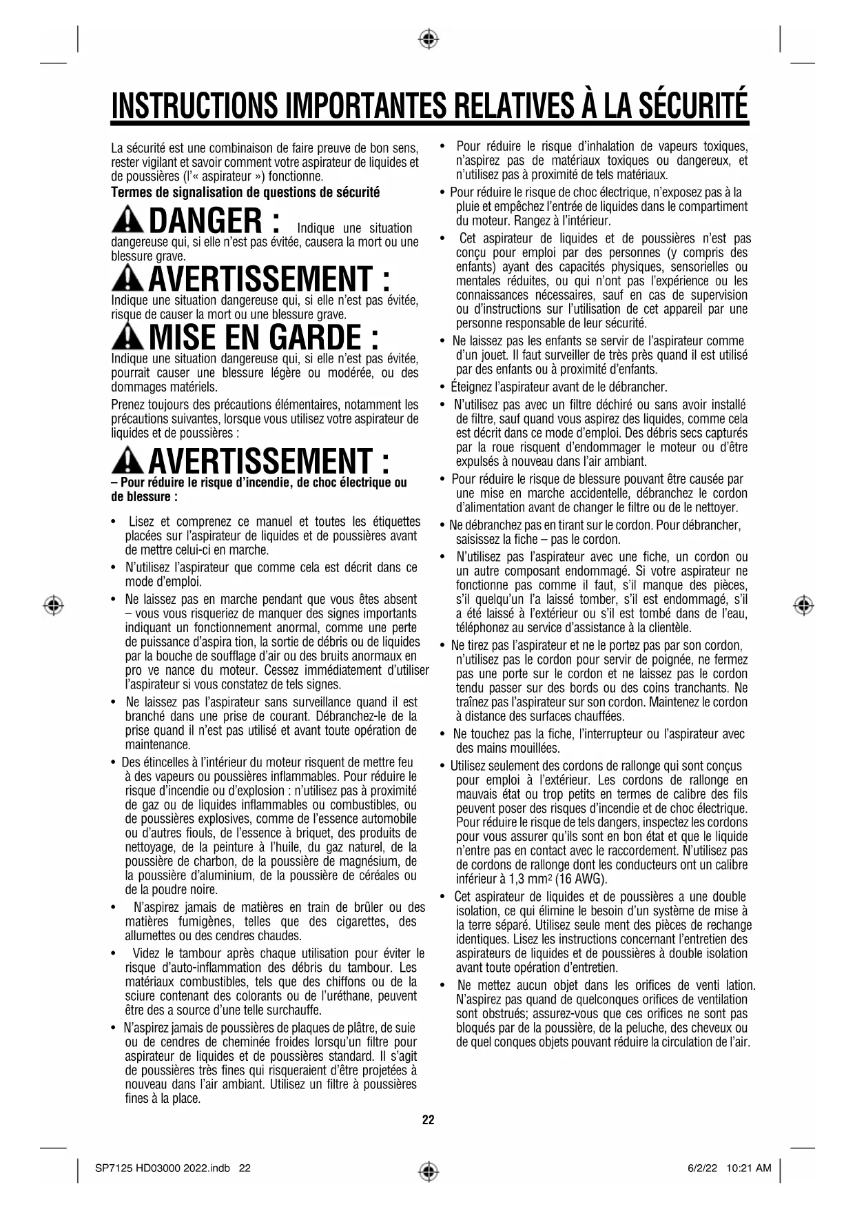 - Ne rangez ni gerbez pas des articles sur le dessus de l’aspirateur SP7125 HD03000 2022.indb 23SP7125 HD03000 2022.indb 23 6/2/22 10:21 AM6/2/22 10:21 AM24 Ensemble de bloc-moteurTambour à poussièreInterrupteurRangement du tuyauLoquet de verrouillage de l’ensemble de bloc-moteur (2)Cache du couvercle du haut pour le rangement des accessoires Orifice de soufflerie et rangement du cordon d’alimentation Poignée de transport de l’ensemble de bloc-moteur Couvercle de rangement du côté gauche Tuyau flexible extensibleOrificed’admissionde l’aspirateurBrosse de dépoussiérageSuceur platCompartiment de rangement des accessoires SWEEP Orificed’admissionde l’aspirateurOrifice d’admission SWEEP Cordond’alimentationSortie du cordon Orifice de soufflanteCache du couvercle du haut Loquet de verrouillage du cache du couvercle du haut Ramasse-poussière SWEEP INTRODUCTION APPRENDRE À CONNAÎTRE VOTRE ASPIRATEUR DE LIQUIDES ET DE POUSSIÈRES Tuyau flexible extensible – Permet de transférer la capacité d’aspirer ou de souffler sur le site de travail. Fournit le moyen de connecter des tubes de rallonge et des suceurs. Suceur plat – Suceur pour aspirer les matériaux secs lors du nettoyage des intérieurs et de la plupart des garnitures de véhicules. Brosse de dépoussiérage – Sert à nettoyer des surfaces couvertes de poussières ou débris fins. Idéal pour un nettoyage détaillé. Familiarisez-vous avec les commandes et les fonctions de votre aspirateur avant de le faire fonctionner. II faut bien se familiariser avec les accessoires qui ont été inclus avec cet aspirateur. Chaque accessoire peut être utilisé de façons multiples pour l’aspiration ou le soufflage de débris. Voici une liste des accessoires et des divers moyens de les utiliser. Cet aspirateur de liquides et de poussières est conçu pour emploi résidentiel seulement. Il peut être utilisé pour aspirer des matières humides ou sèches, et il peut également faire fonction de souffleuse. Familiarisez-vous avec les fonctions suivantes de ce produit, et lisez le manuel de l’opérateur du début à la fin pour des détails spécifiques quant à l’utilisation de votre nouvel aspirateur. SP7125 HD03000 2022.indb 24SP7125 HD03000 2022.indb 24 6/2/22 10:21 AM6/2/22 10:21 AM25