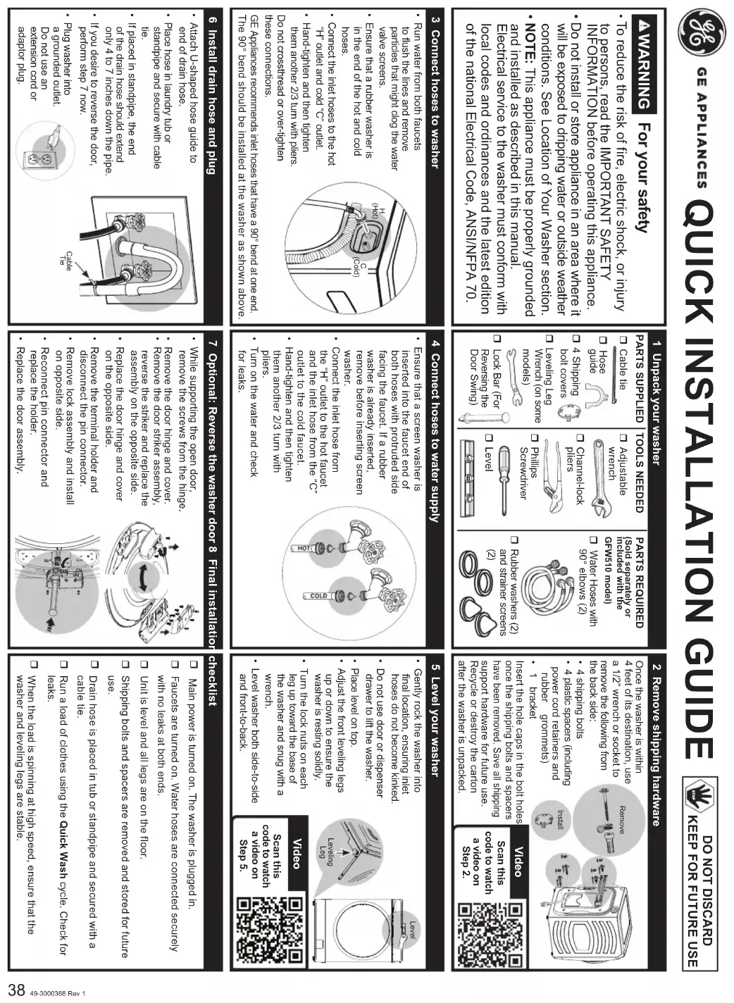 - Retirez les 3 vis du couvercle de charnière puis retirez le couvercle. • Retirez les 6 vis de la charnière puis retirez la charnière de la porte.Couvercle de charnièreCharnièreDébranchez l’appareil ou fermez son disjoncteur avant de procéder à l’entretien. Appuyer sur le bouton d’alimentation Power de l’appareil NE le déconnecte PAS de l’alimentation. - Risque d’électrocution Certaines pièces internes sont intentionnellement non mises à la terre et peuvent présenter un risque de choc électrique lors d’un entretien.Personnel de réparateur – NE PAS toucher aux composants suivants lorsque l’appareil est sous tension : robinet d’eau, pompe de vidange, NTC, élément chauffant, verrou de porte, carte d’onduleur, moteur et carte MC. AVERTISSEMENT AVERTISSEMENT Tenir la porte et retirer les vis de charnière de la laveuseCharnière et assemblage de porteVideoScan this code to watch a video on this topic.28 49-3000368 Rev 1 Instructions d’installation